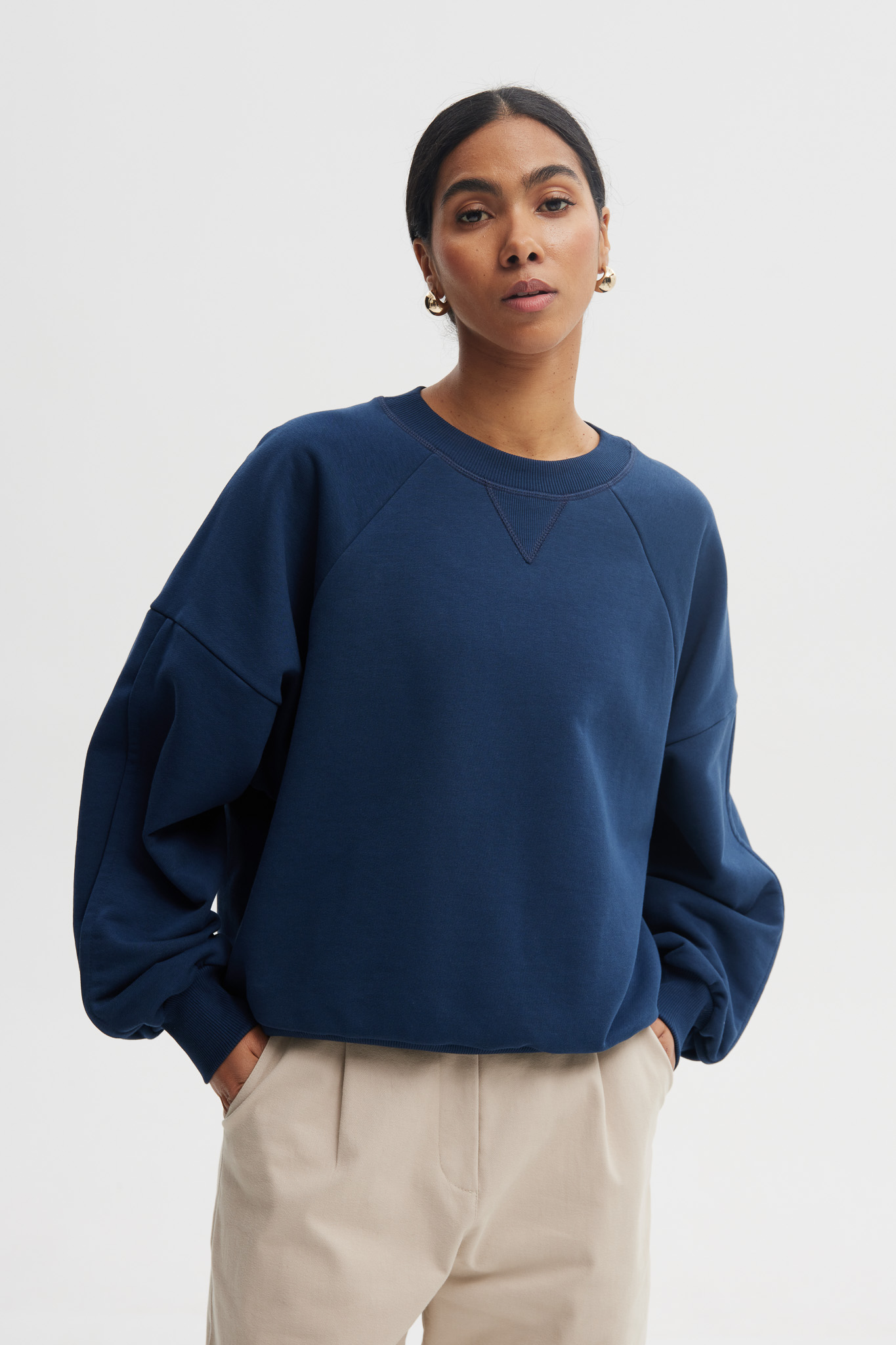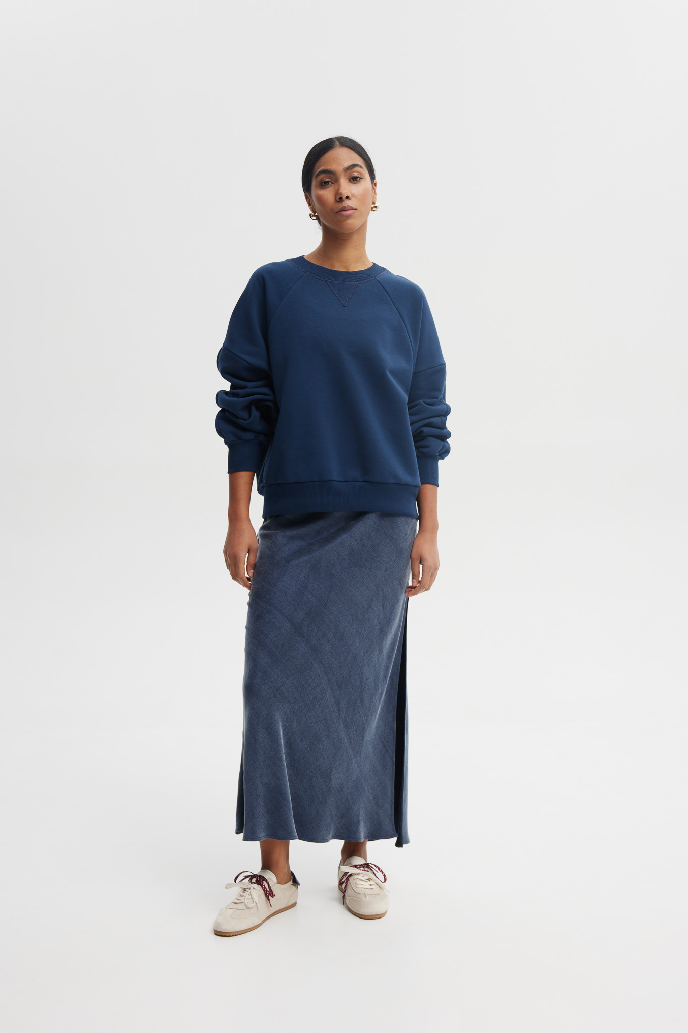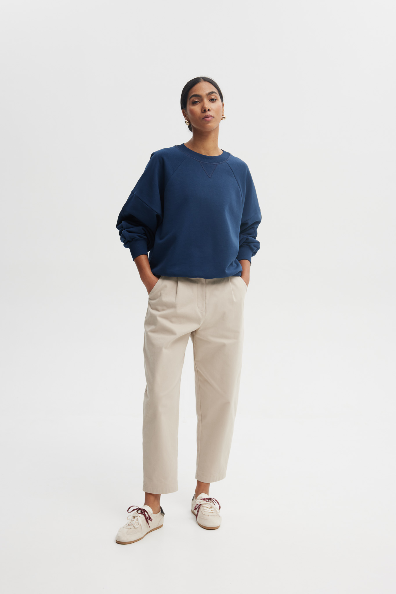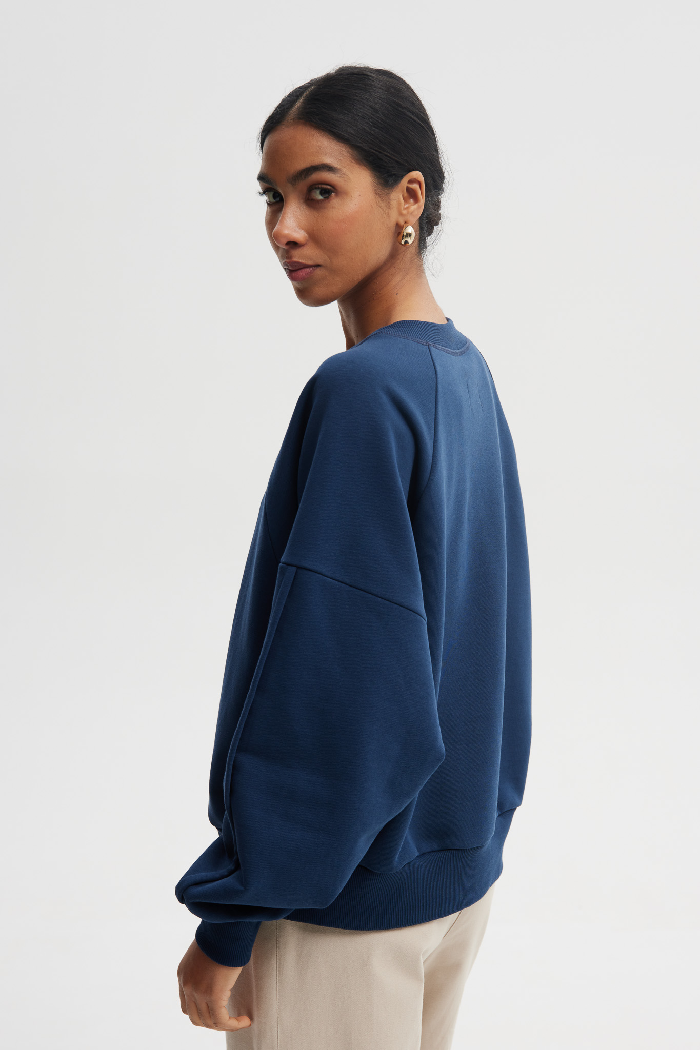 Minimalistyczna bluza o nowoczesnym, swobodnym kroju w eleganckim odcieniu granatu. Wykonana z miękkiej bawełny z dodatkiem poliestru, zapewnia wysoki komfort noszenia i idealne dopasowanie do sylwetki. Doskonała zarówno do casualowych, jak i bardziej stylowych codziennych zestawów.