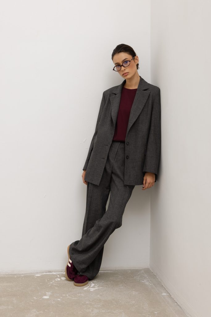 Strukturalna marynarka + spodnie o prostej linii. Alternatywą w kapsule może być także formalna spódnica midi, która stabilizuje proporcje bioder.