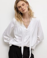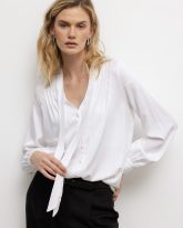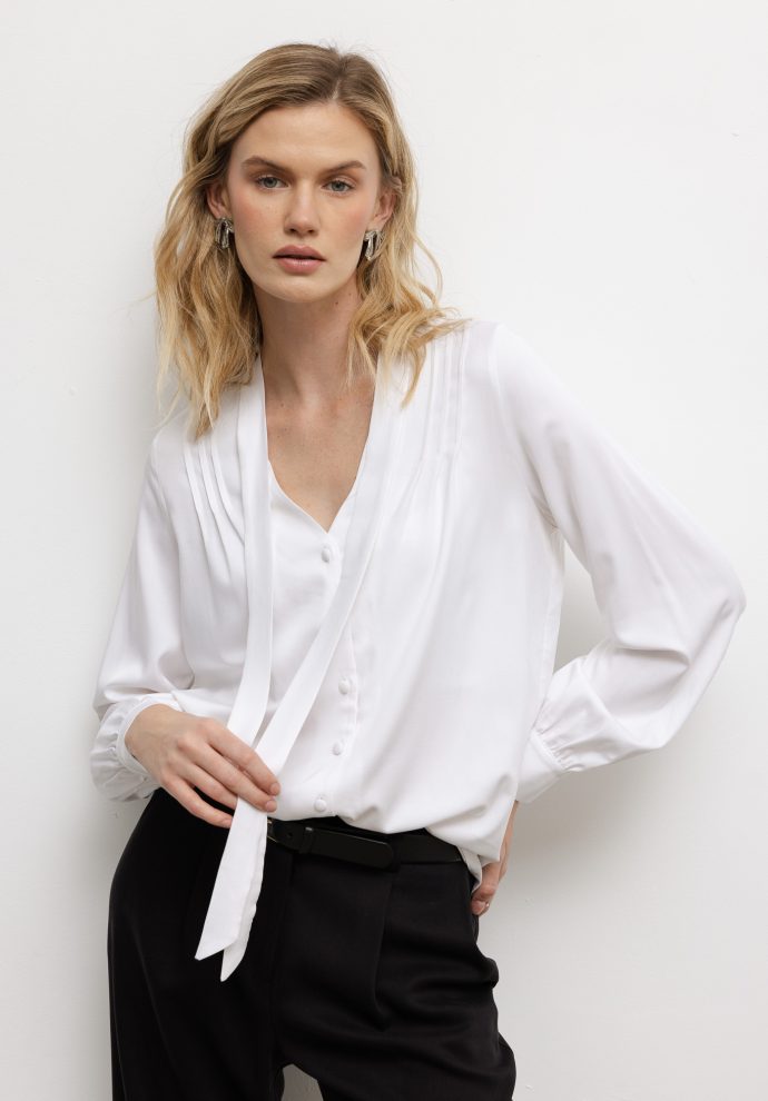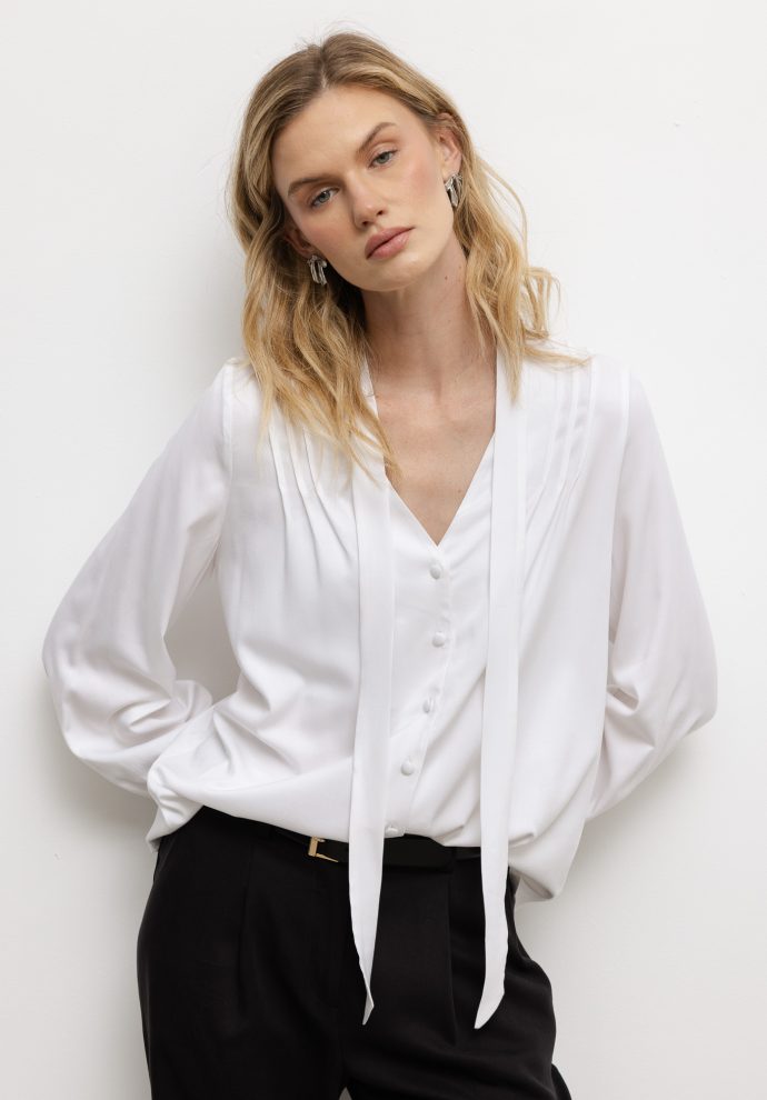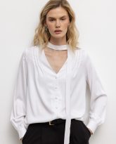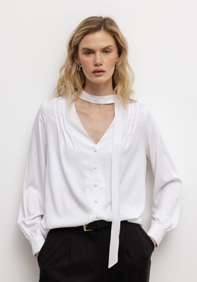 Przód koszuli prezentuje się niezwykle elegancko. Dekolt w kształcie litery V podkreśla dekolt i optycznie wydłuża szyję. Zintegrowana szarfa nadaje koszuli niepowtarzalny charakter. Możesz ją zawiązać wokół szyi, tworząc efektowny akcent i podkreślając swój indywidualny styl. Rękawy kończą się mankietami, które dodają koszuli formalności i klasy. Z tyłu koszuli, u góry, znajdują się zaszewki, które pozwalają na doskonałe dopasowanie do sylwetki. Dzięki nim koszula doskonale się układa, podkreślając linię pleców i talii. To szczegół, który gwarantuje komfort noszenia i pozwala na swobodne poruszanie się.