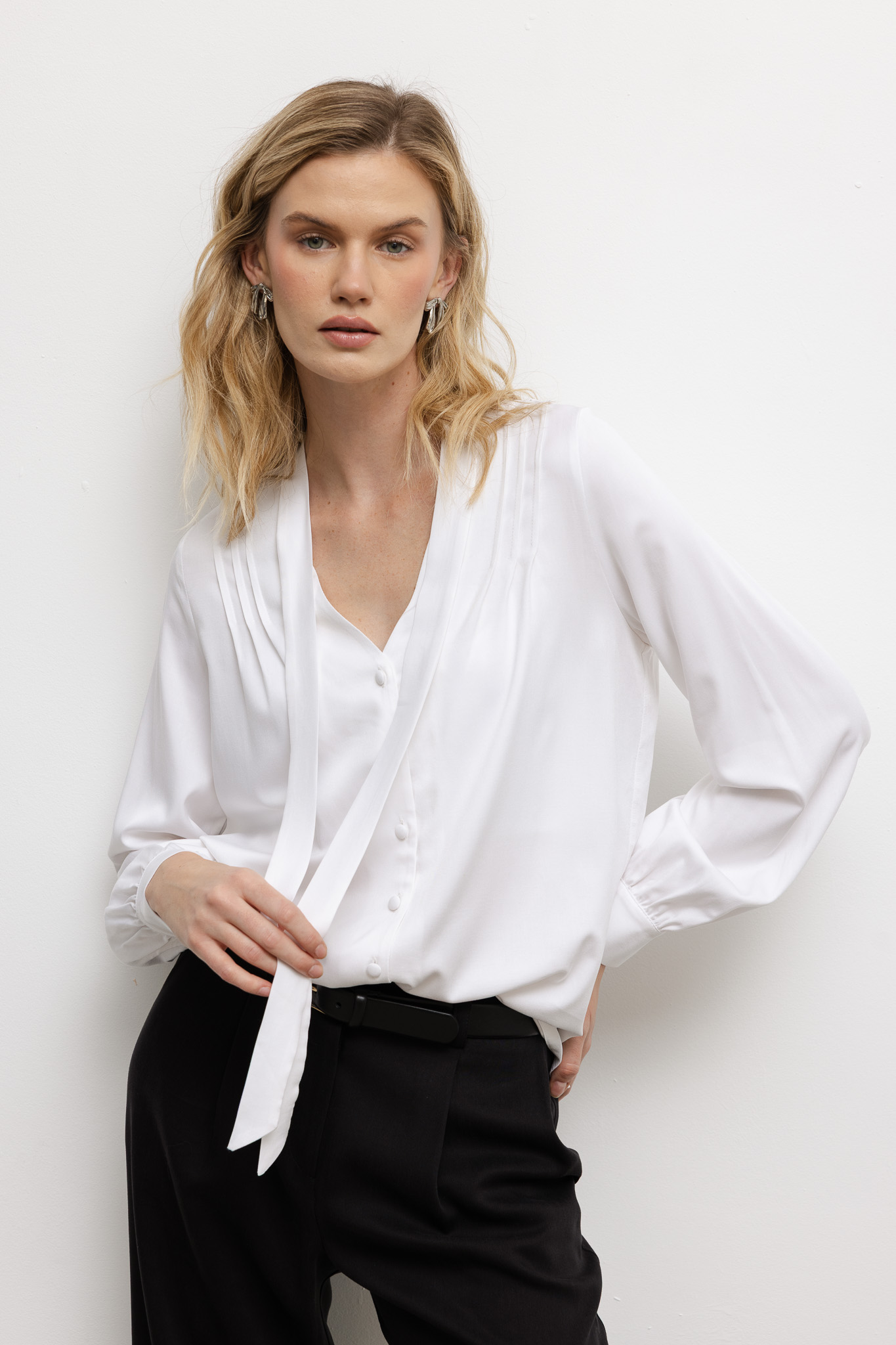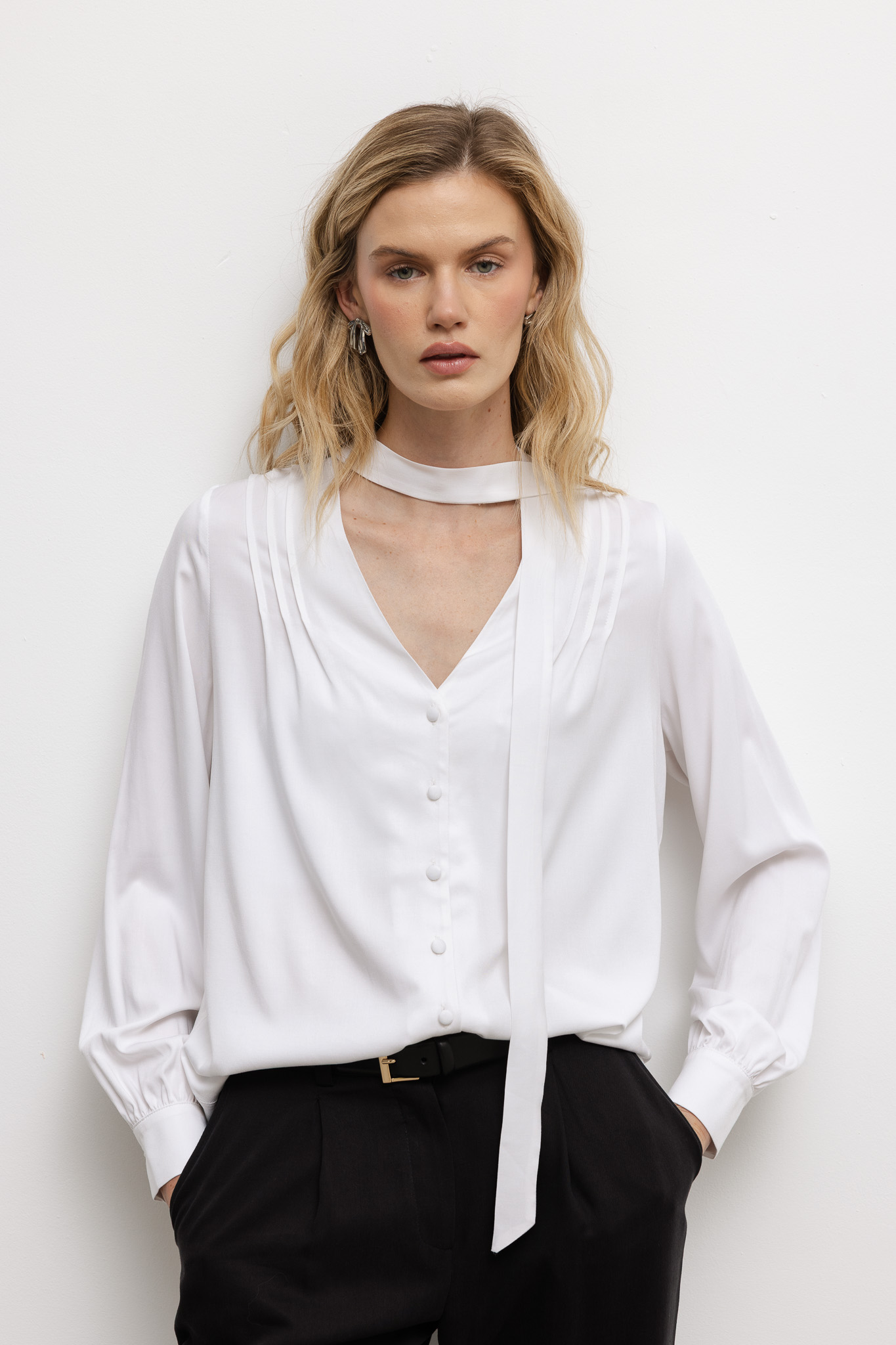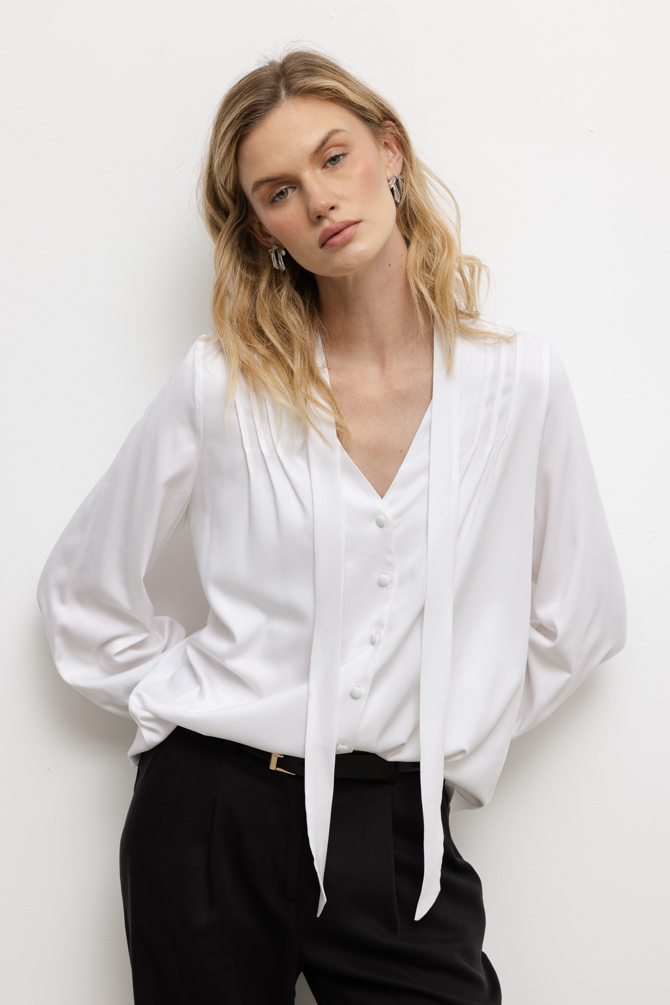 Przód koszuli prezentuje się niezwykle elegancko. Dekolt w kształcie litery V podkreśla dekolt i optycznie wydłuża szyję. Zintegrowana szarfa nadaje koszuli niepowtarzalny charakter. Możesz ją zawiązać wokół szyi, tworząc efektowny akcent i podkreślając swój indywidualny styl. Rękawy kończą się mankietami, które dodają koszuli formalności i klasy. Z tyłu koszuli, u góry, znajdują się zaszewki, które pozwalają na doskonałe dopasowanie do sylwetki. Dzięki nim koszula doskonale się układa, podkreślając linię pleców i talii. To szczegół, który gwarantuje komfort noszenia i pozwala na swobodne poruszanie się.