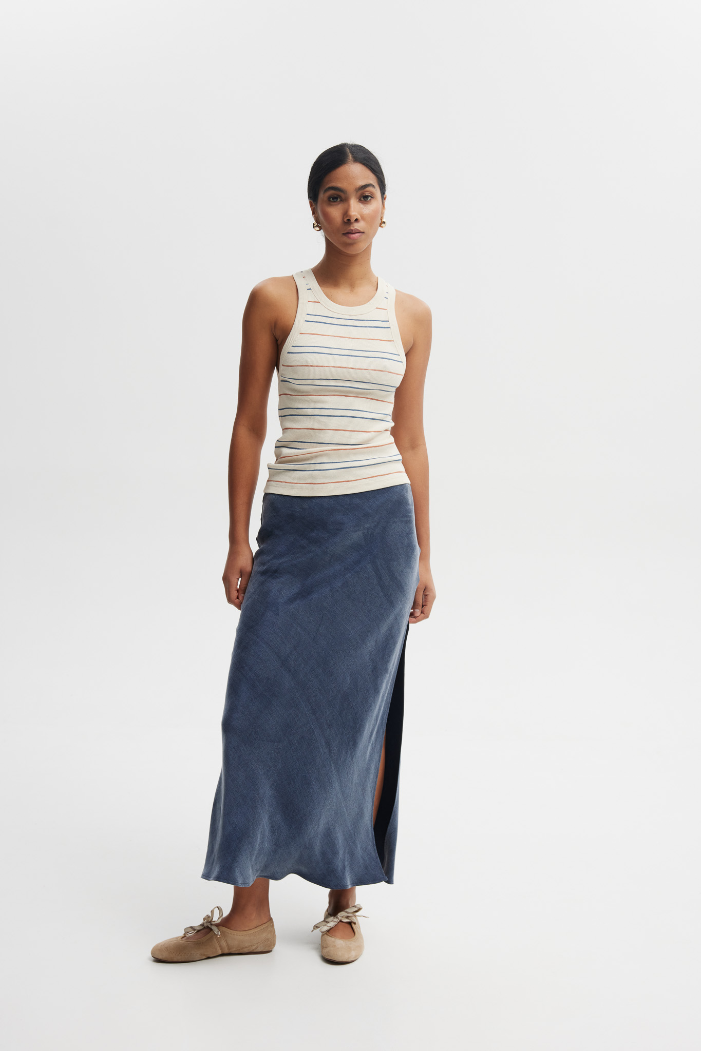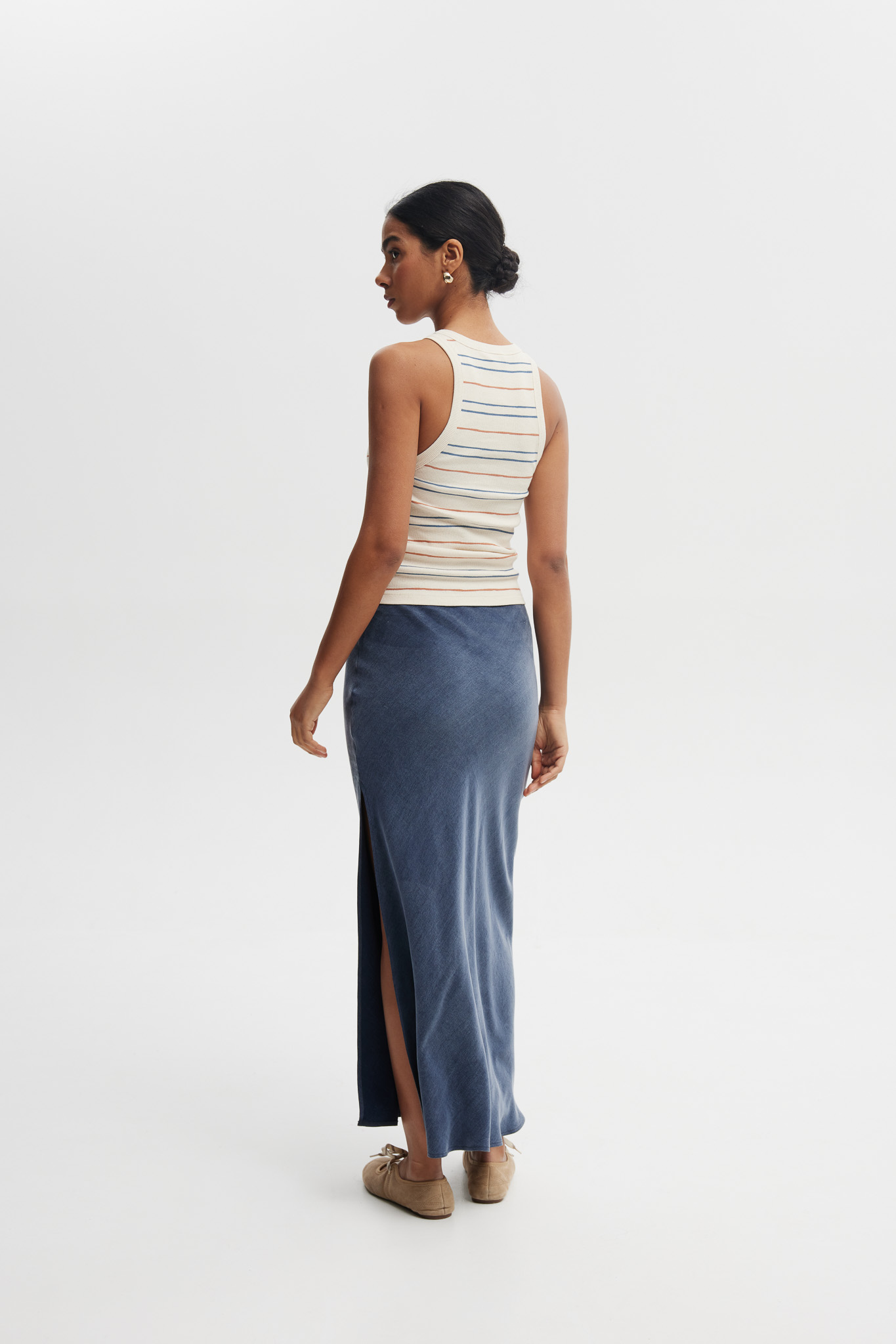 Spódnica Jenny to długa, kobieca propozycja z efektownym rozcięciem, które podkreśla nogi. Elastyczna guma w pasie zapewnia wygodę i idealne dopasowanie do sylwetki. Uszyta z miękkiej, przyjemnej tkaniny z wiskozy i lyocellu, świetnie sprawdzi się na co dzień i na wyjątkowe okazje w sezonie wiosna–lato.
