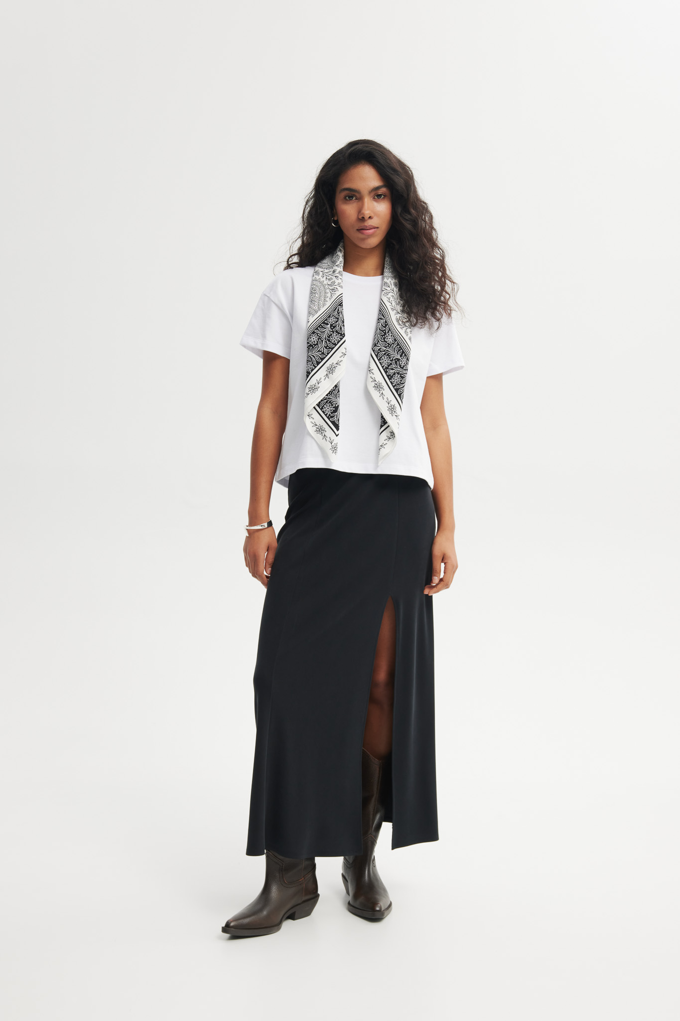 Długa, minimalistyczna spódnica wykonana z miękkiej tkaniny. Lejący materiał subtelnie podkreśla sylwetkę, a przednie rozcięcie dodaje lekkości i zapewnia wygodę noszenia. Neutralny kolor i prosty fason sprawiają, że model doskonale sprawdzi się zarówno w codziennych, jak i bardziej eleganckich stylizacjach.
