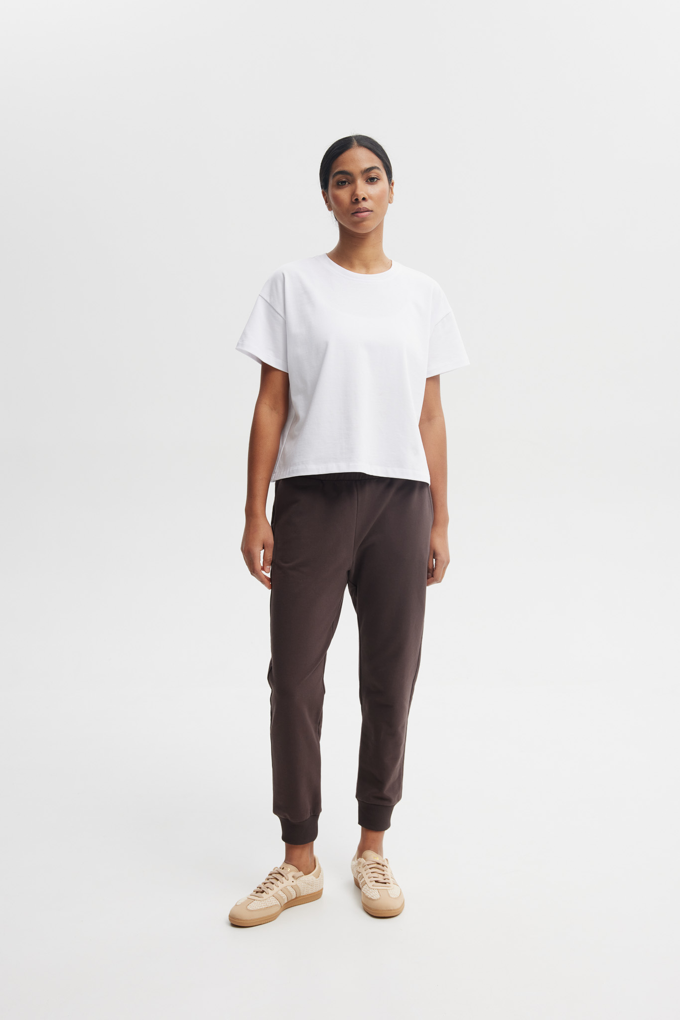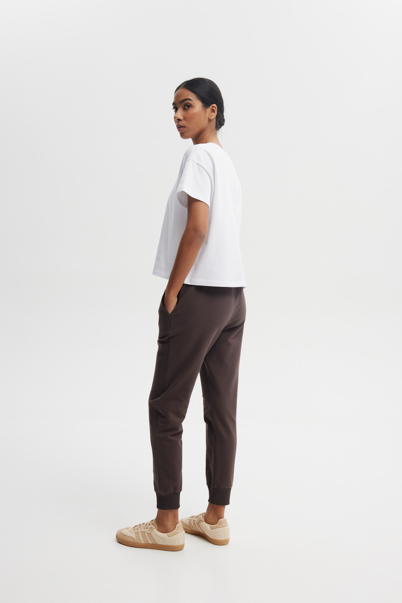 Spodnie Lena to połączenie wygody i stylu na co dzień. Uszyte z wysokiej jakości, miękkiej bawełny, zapewniają komfort noszenia i idealne dopasowanie do sylwetki. Posiadają elastyczny pas, praktyczne kieszenie oraz ściągacze przy nogawkach, które można podwinąć, odsłaniając kostki.