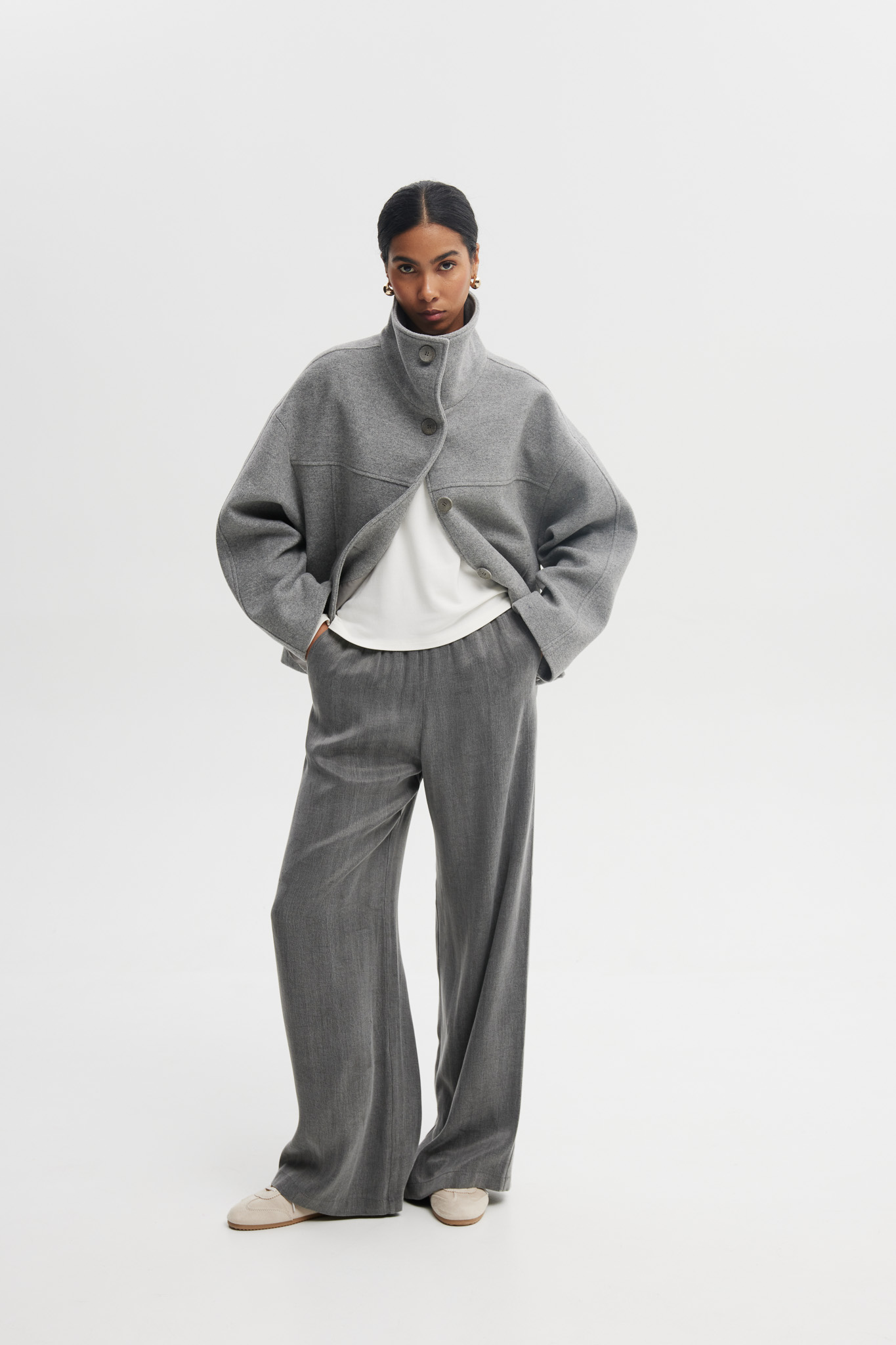 - Luźny, swobodnie układający się krój
