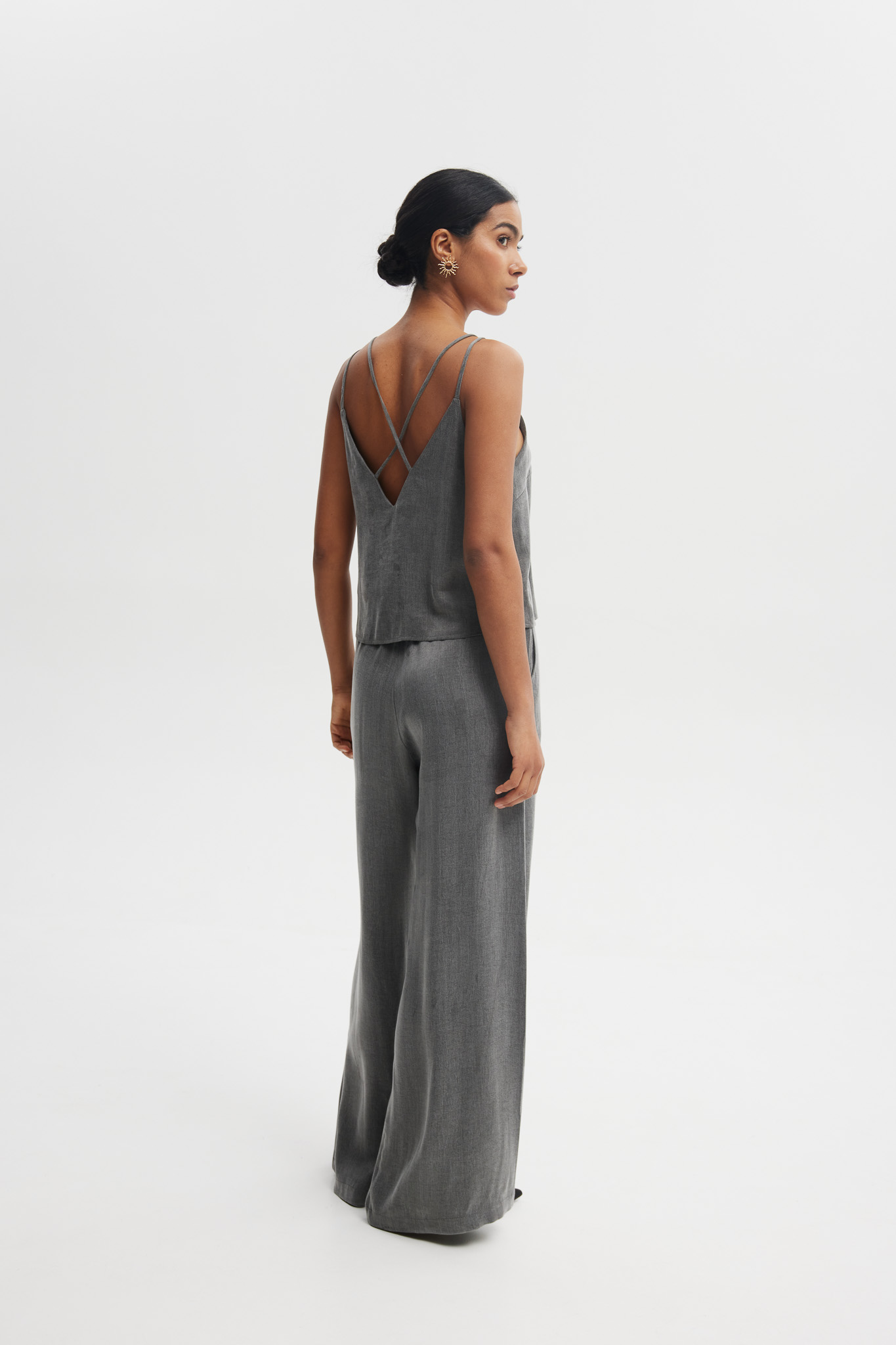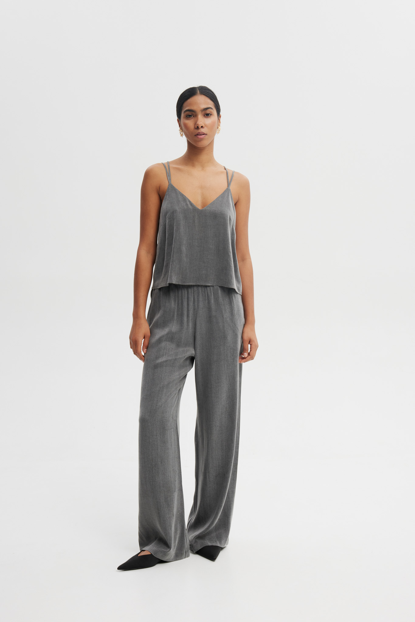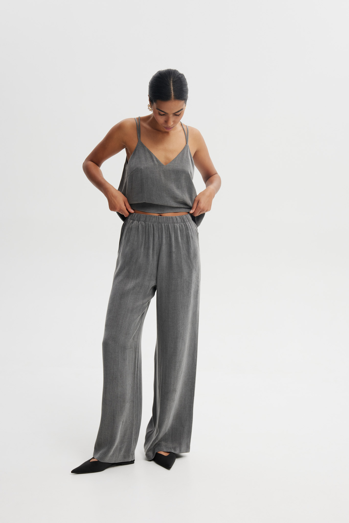 Satynowe spodnie w szarym odcieniu o szerokiej nogawce i wysokim stanie. Lekko połyskujący materiał pięknie się układa, nadając stylizacji elegancji i subtelnej lekkości. Idealne zarówno do wieczorowych zestawów, jak i nowoczesnych, codziennych stylizacji.