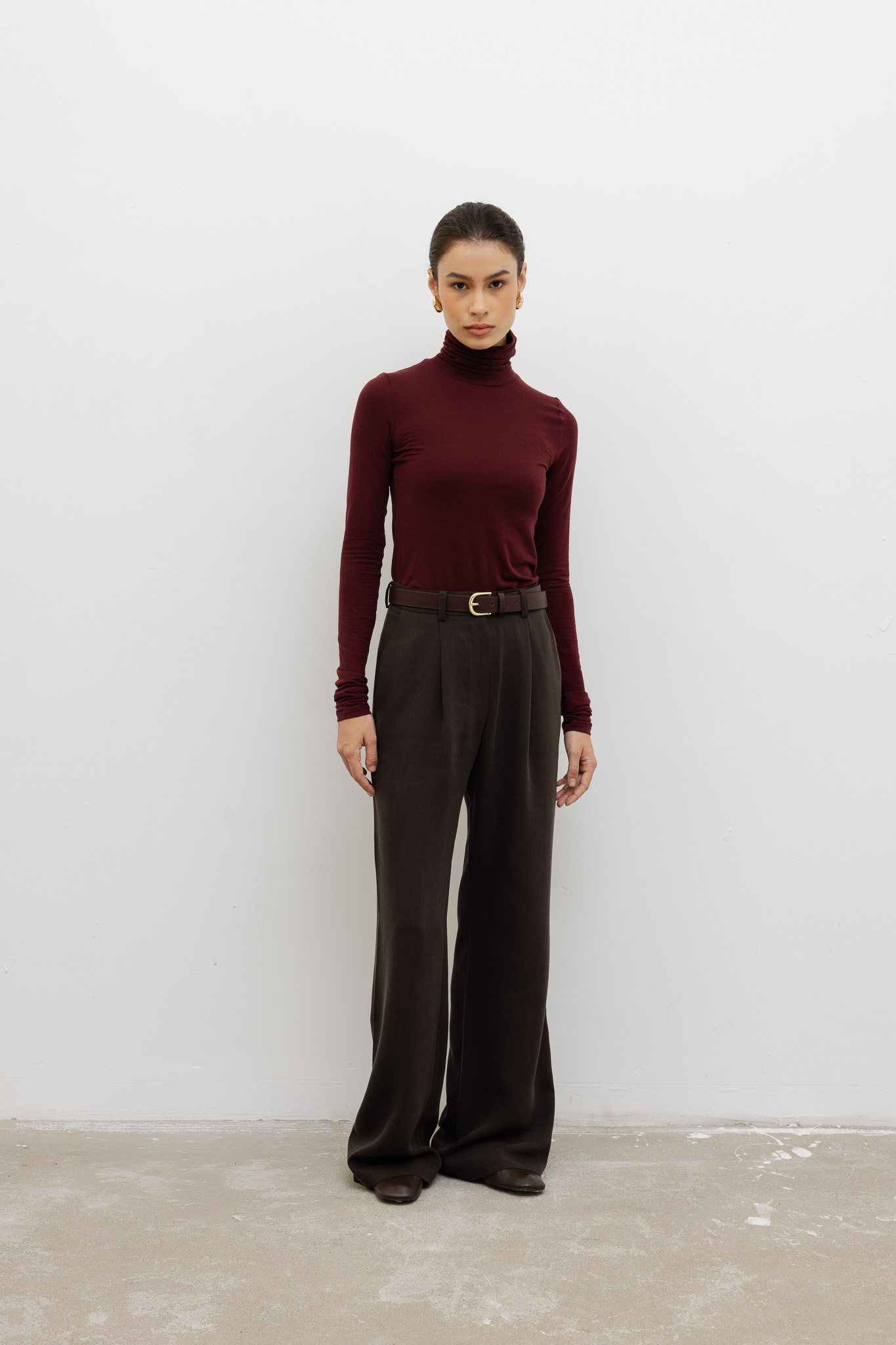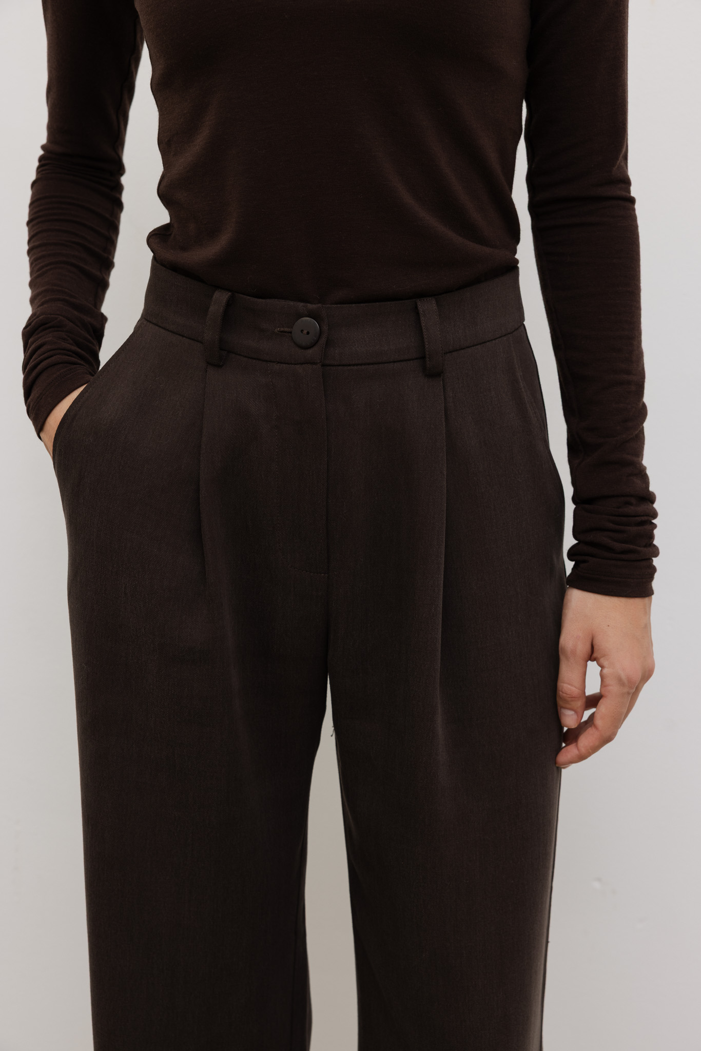 Szlachetny orzechowy odcień dodaje im elegancji, a wysoki stan podkreśla talię i optycznie wydłuża nogi.