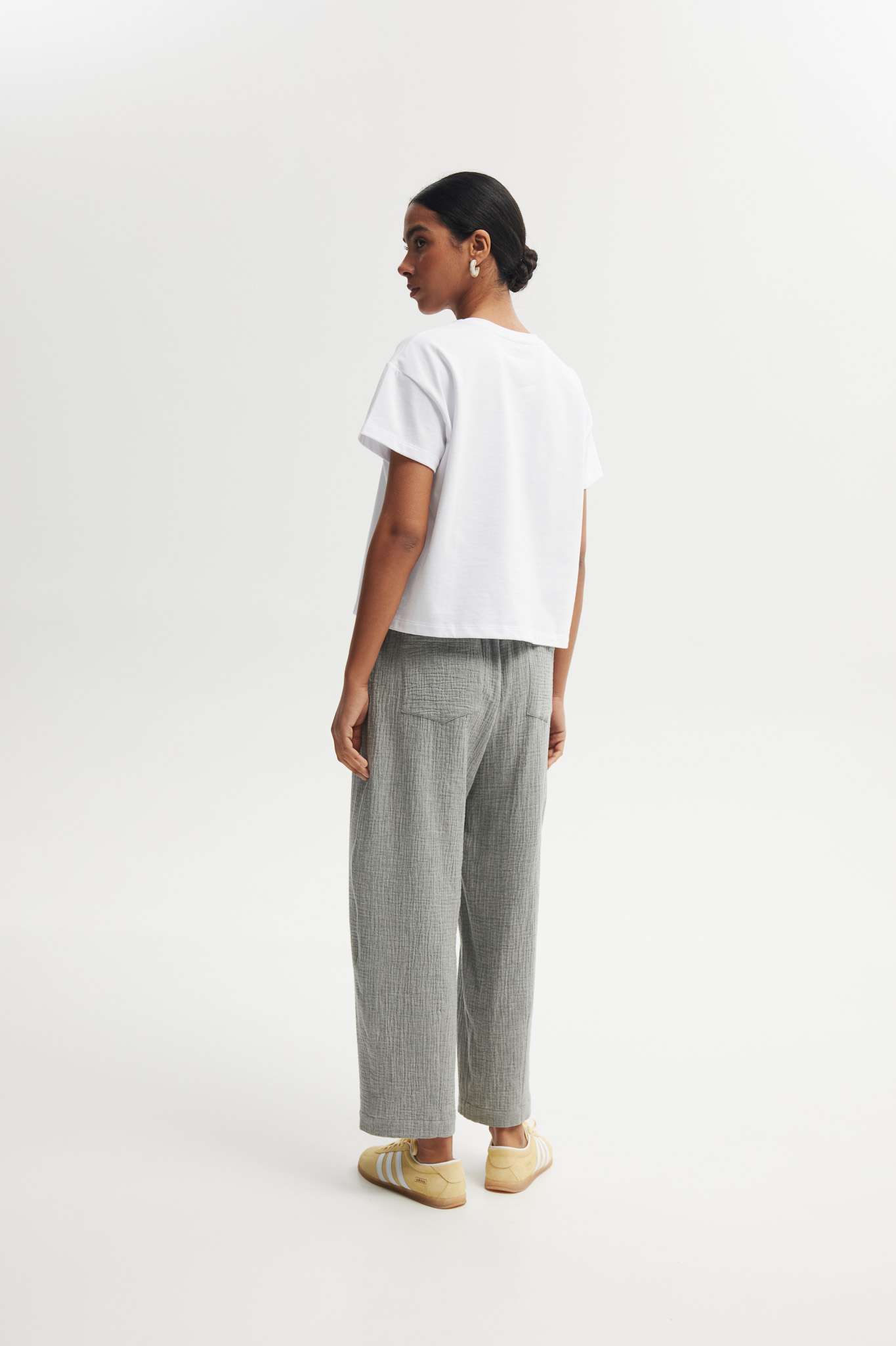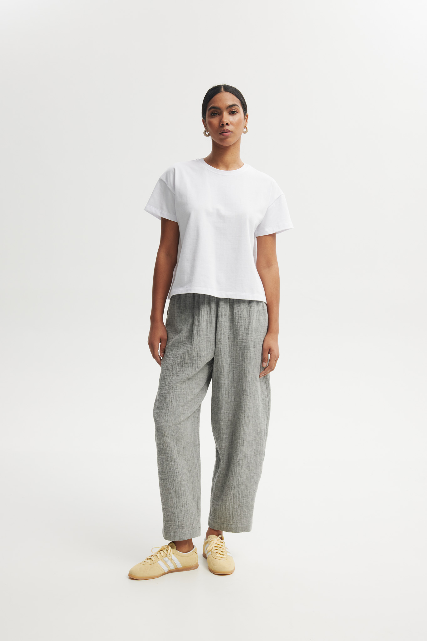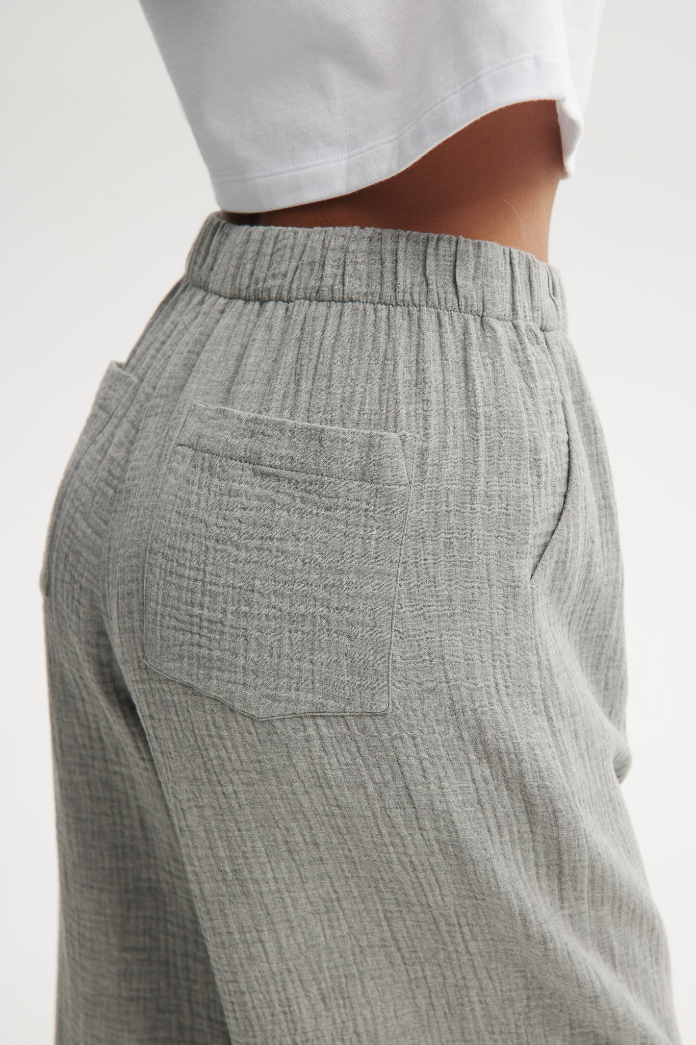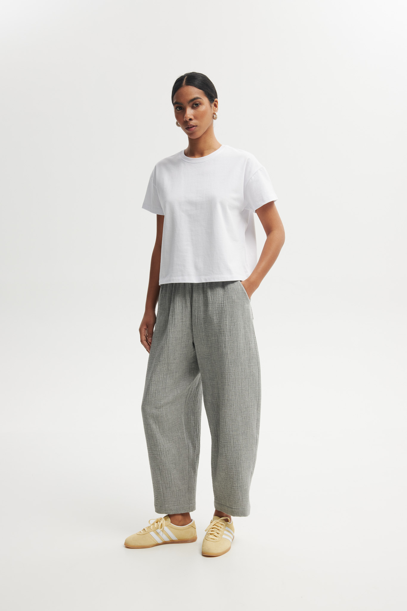 Luźne, minimalistyczne spodnie o casualowym charakterze, wykonane z lekkiego, materiału w odcieniu szarości. Mają swobodny krój i elastyczną talię, co zapewnia wygodę i nonszalancki, letni styl.
