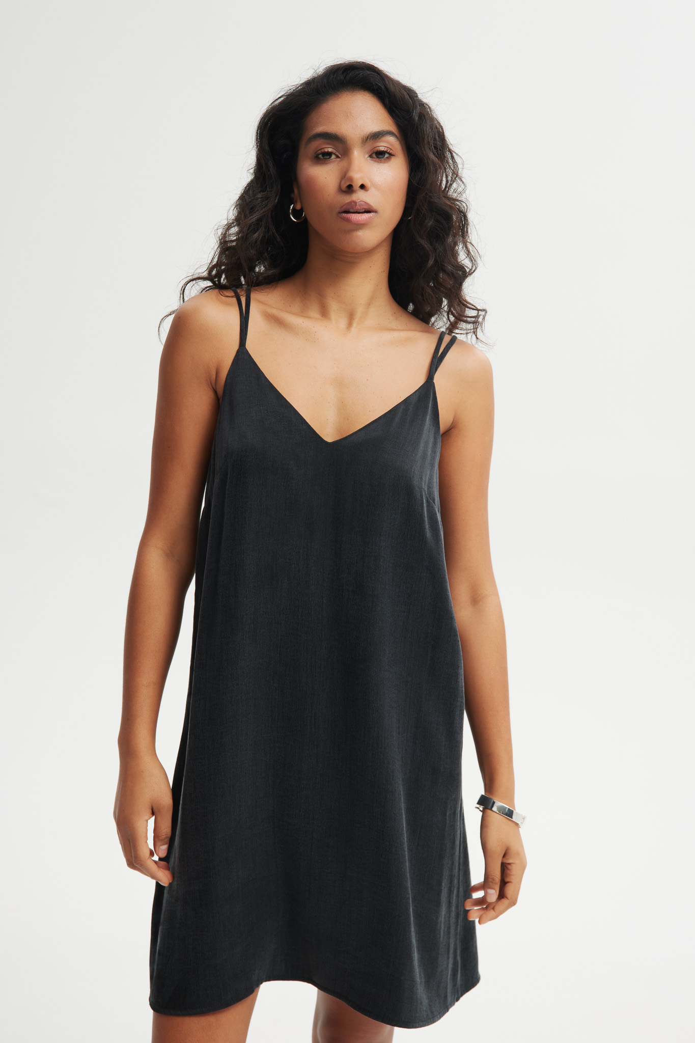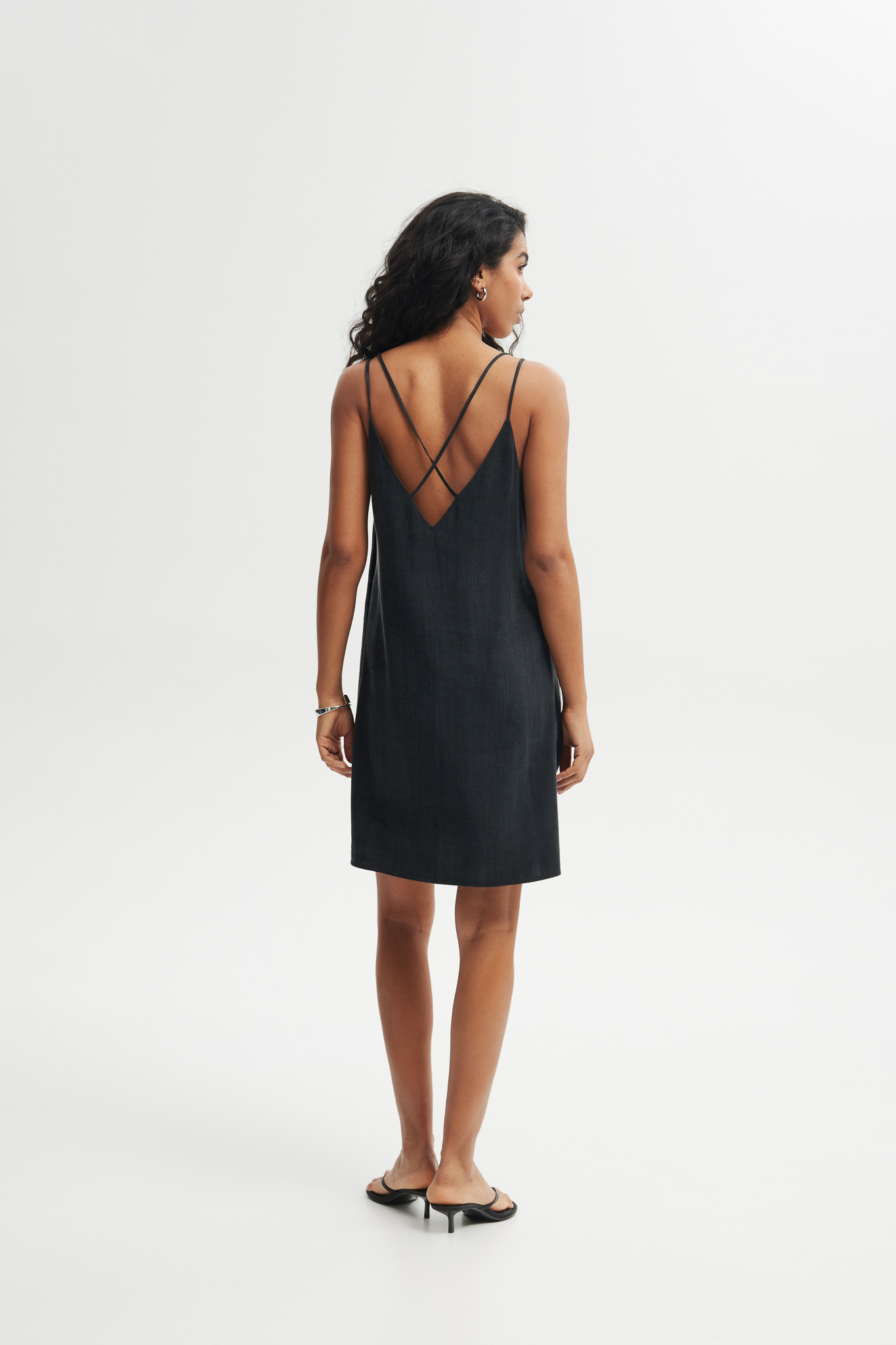 Ma cienkie ramiączka, głęboki dekolt z przodu i z tyłu oraz luźny krój, który miękko układa się na sylwetce. Krzyżujące się ramiączka na plecach dodają jej subtelnego charakteru.