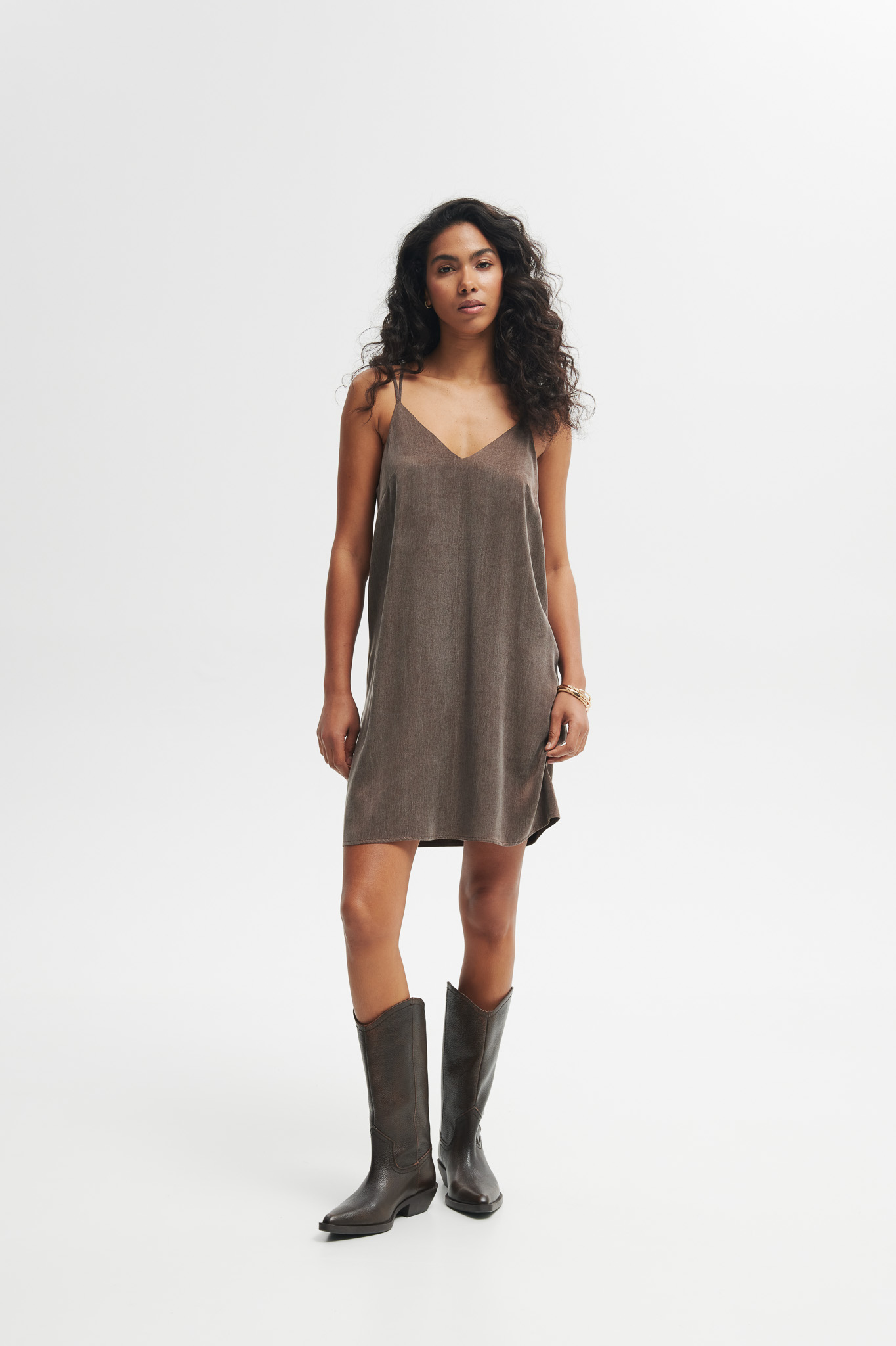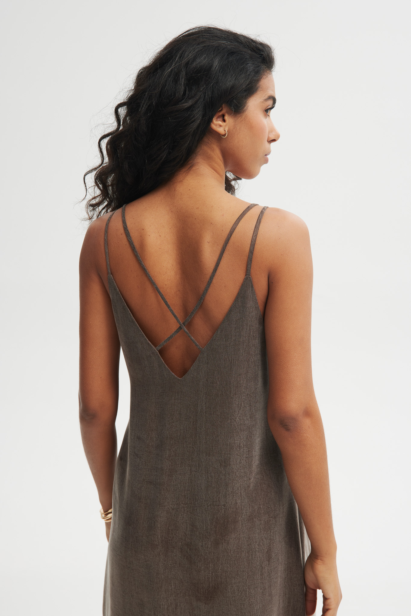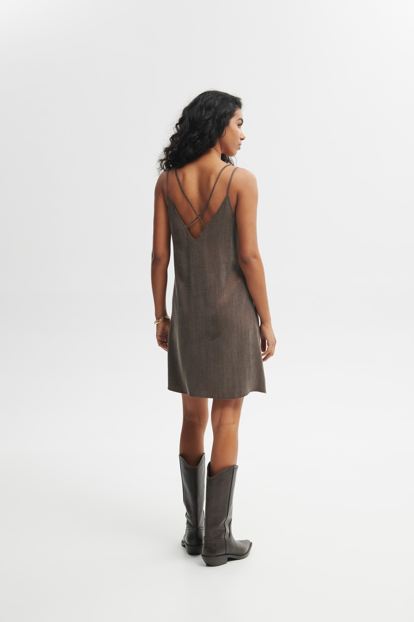Sukienka ma cienkie ramiączka, głęboki dekolt z przodu i z tyłu oraz lekko luźny krój w stylu “slip dress”. Całość układa się miękko i swobodnie, bez opinania sylwetki.