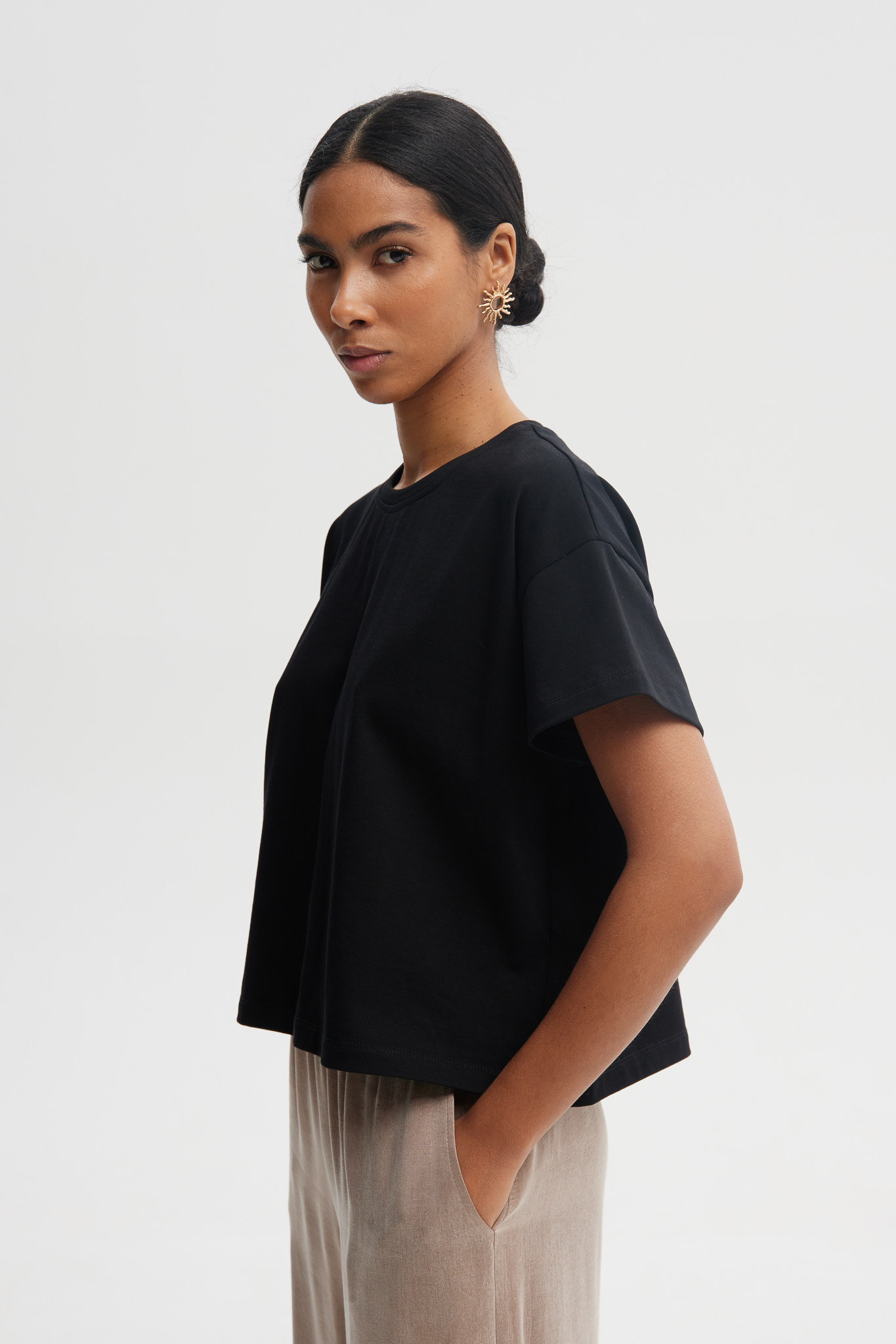 Bawełniany t-shirt damski o prostym, wygodnym kroju. Wykonany w 100% z naturalnej, oddychającej bawełny, łączy komfort noszenia z delikatnym, kobiecym akcentem. Idealny do codziennych i eleganckich stylizacji.