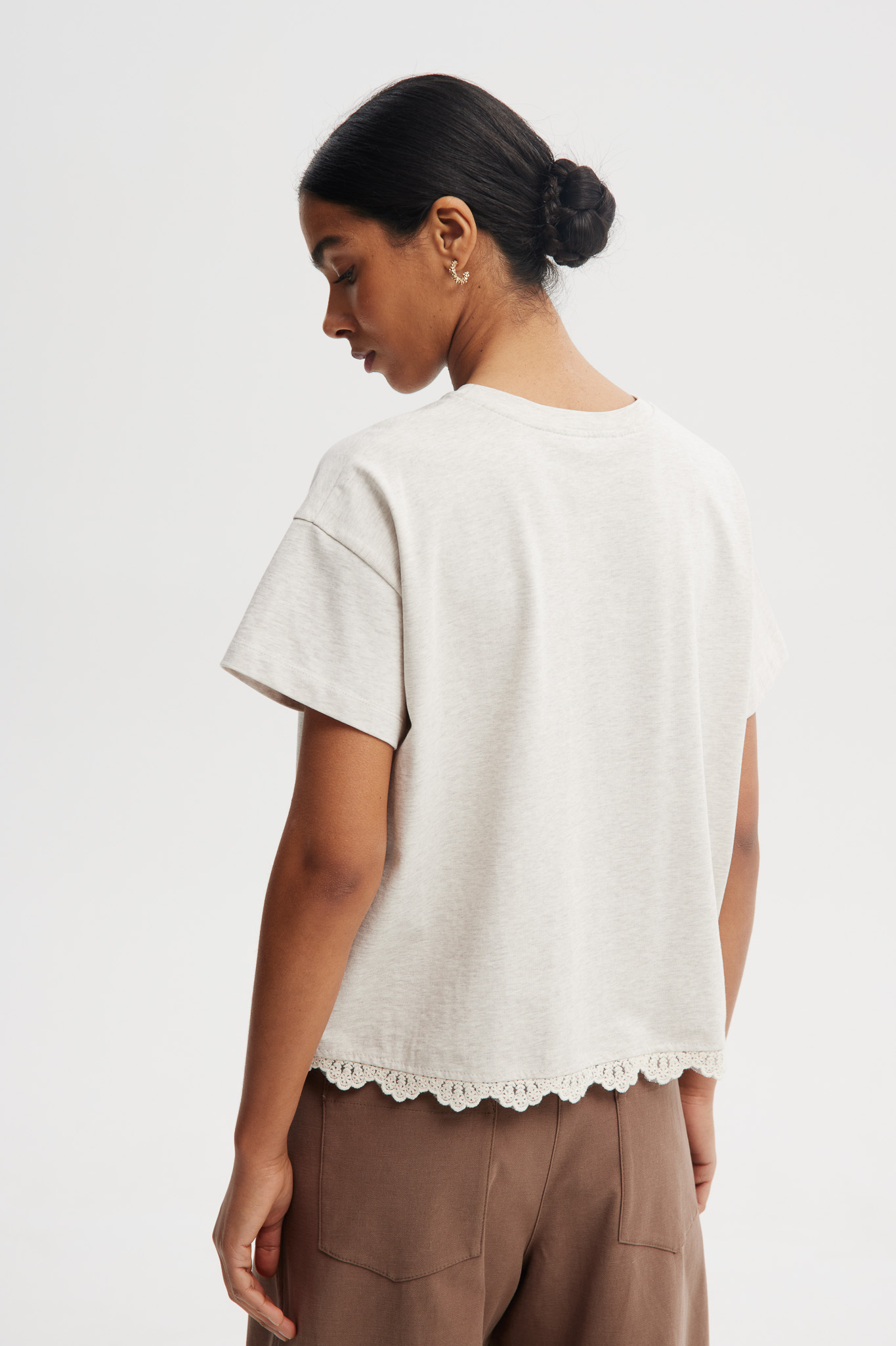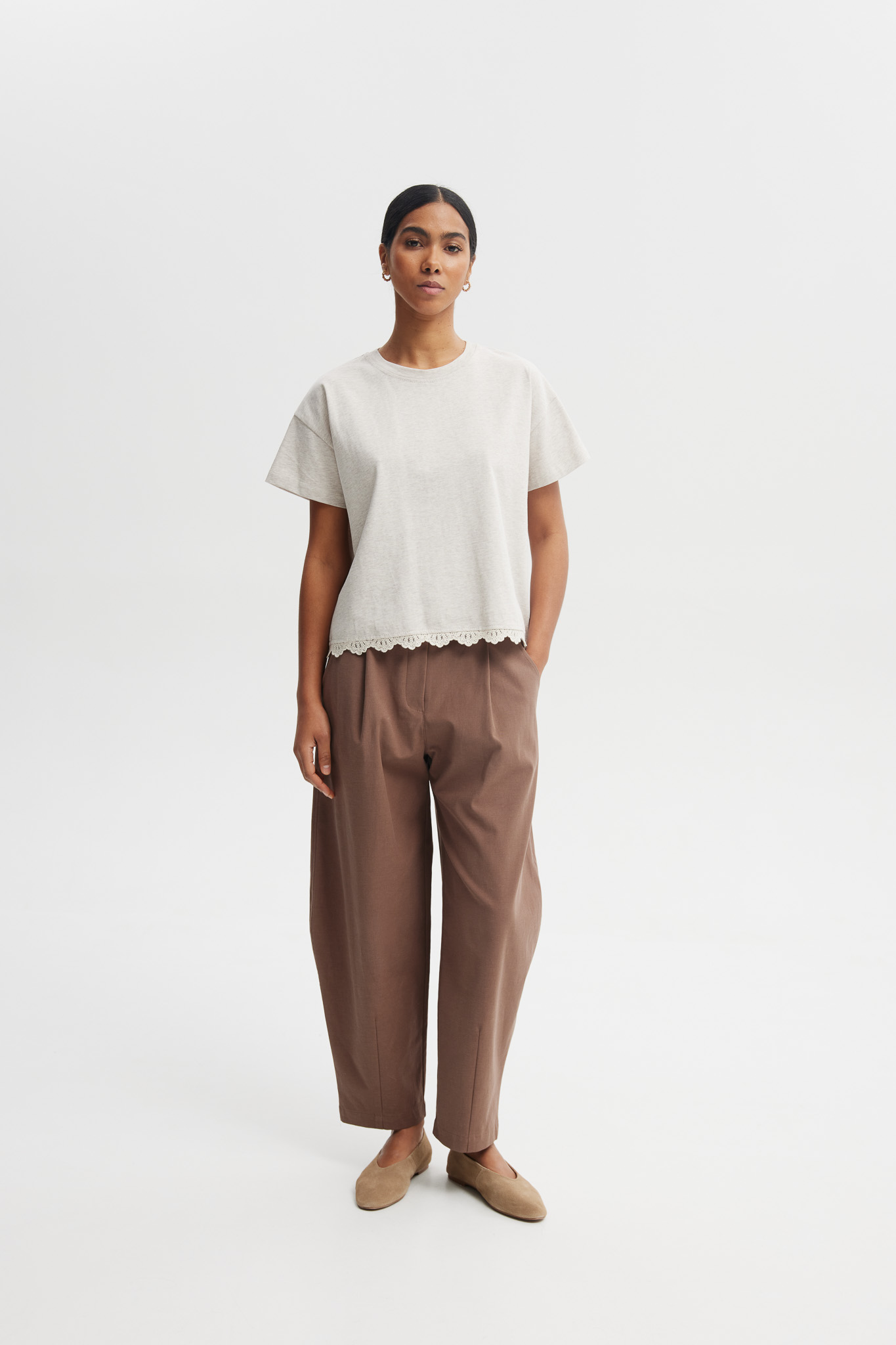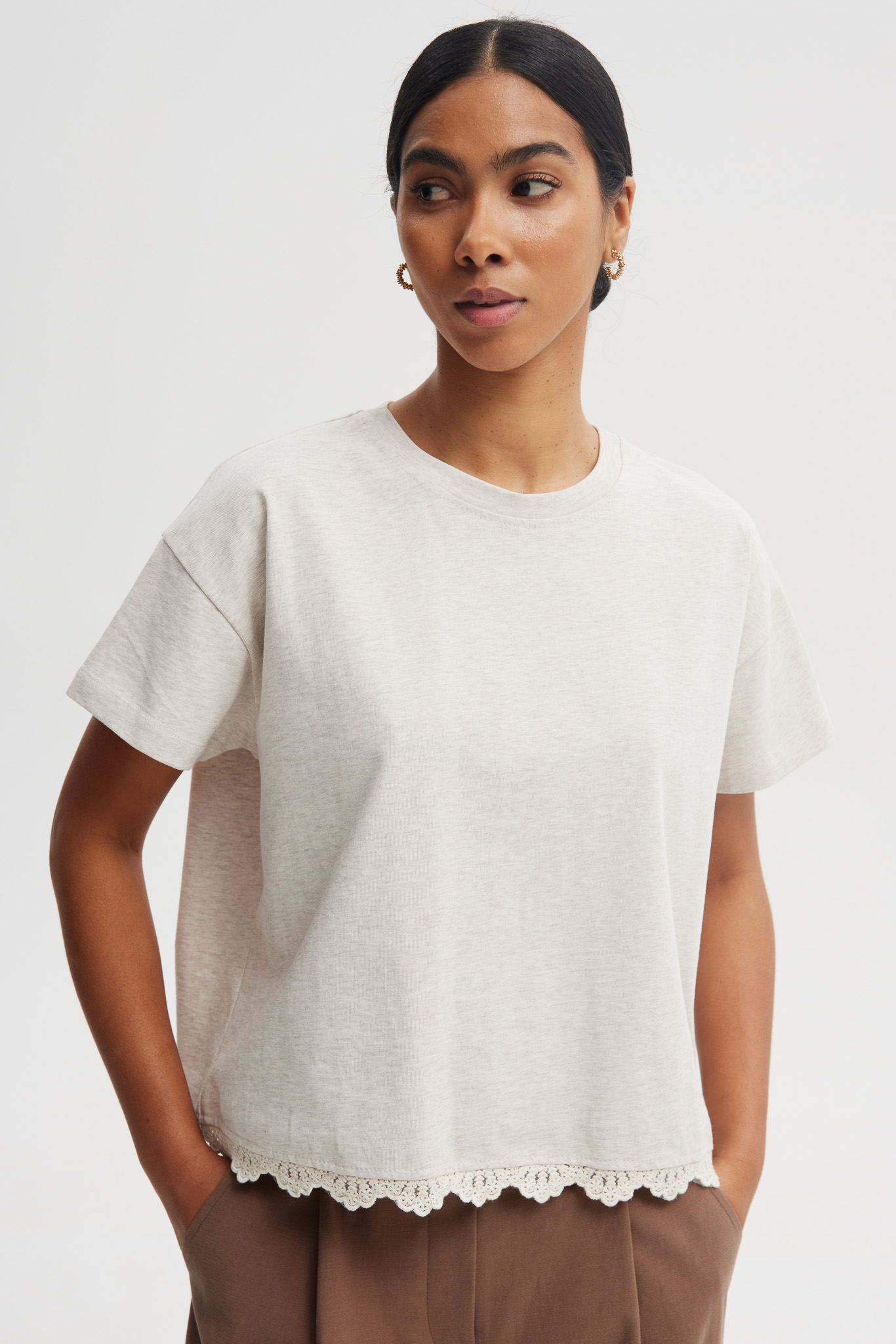 T-SHIRT NAOMI MELANŻ PIASKOWY damski bawełniany t-shirt z koronką melanż piaskowy