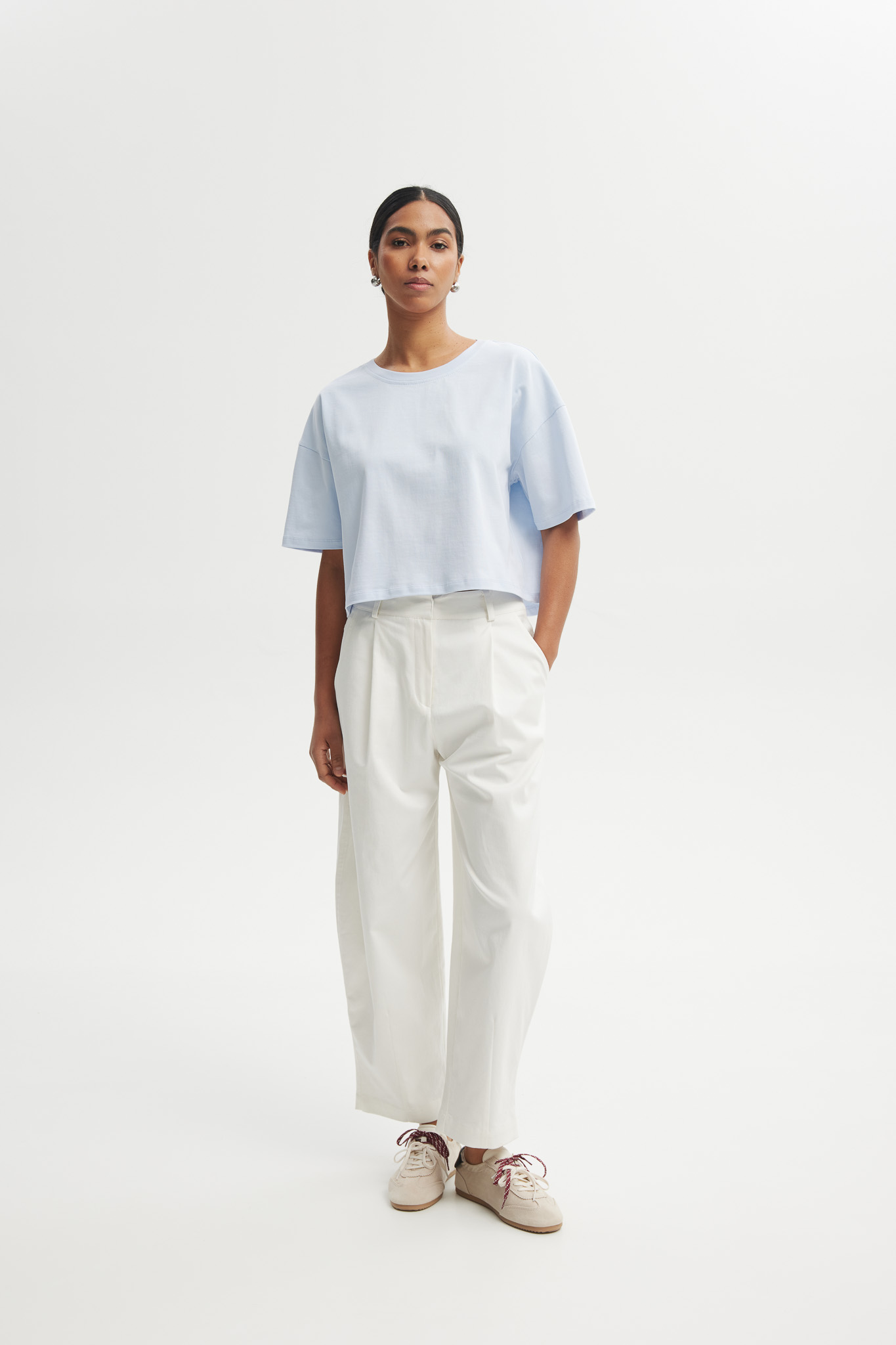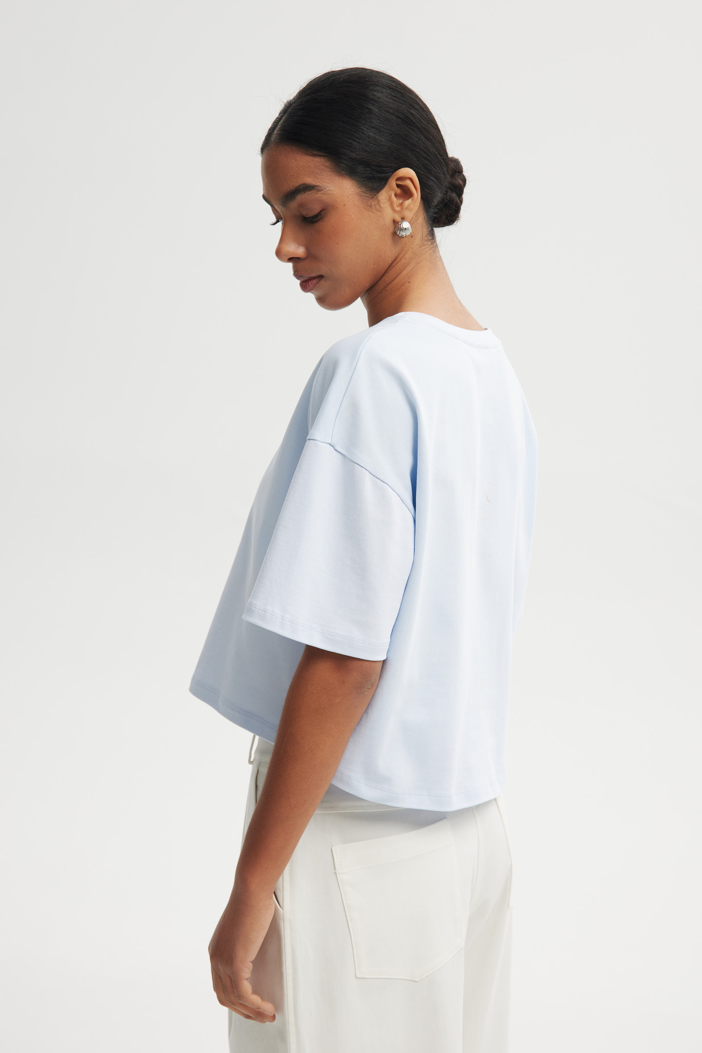 Klasyczny t-shirt damski wykonany w 100% z bawełny, który zapewnia komfort i przewiewność przez cały dzień. Model o luźnym, nowoczesnym kroju z lekko skróconą długością i szerokimi rękawami. Minimalistyczny design sprawia, że t-shirt doskonale sprawdzi się w codziennych stylizacjach – zarówno z jeansami, jak i eleganckimi spodniami czy spódnicą.