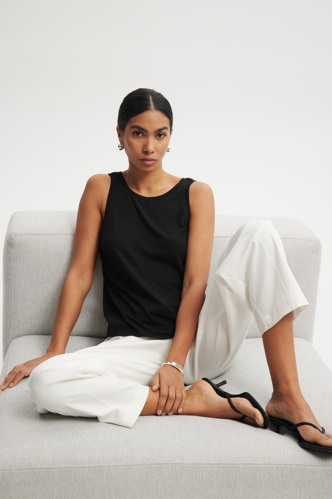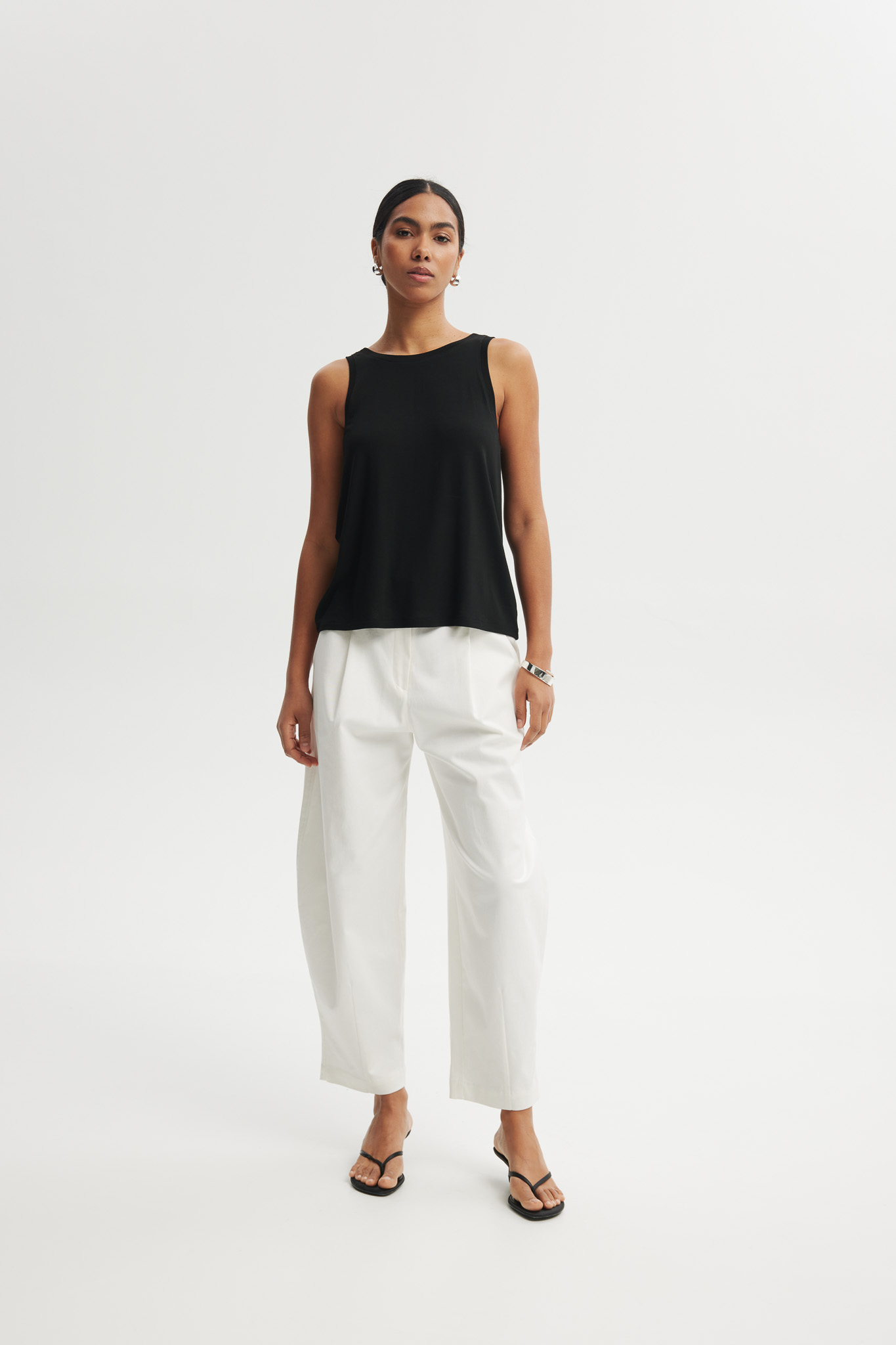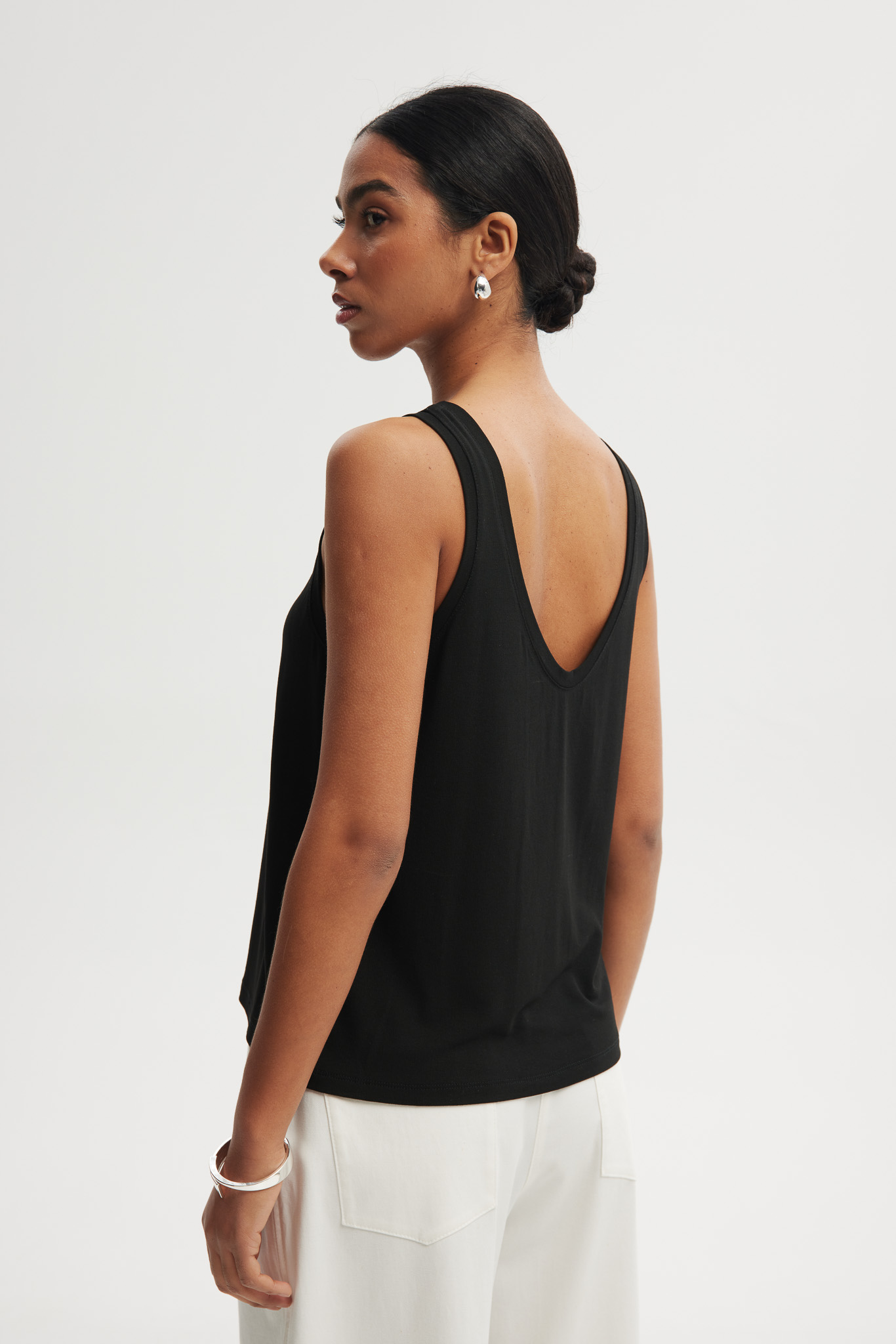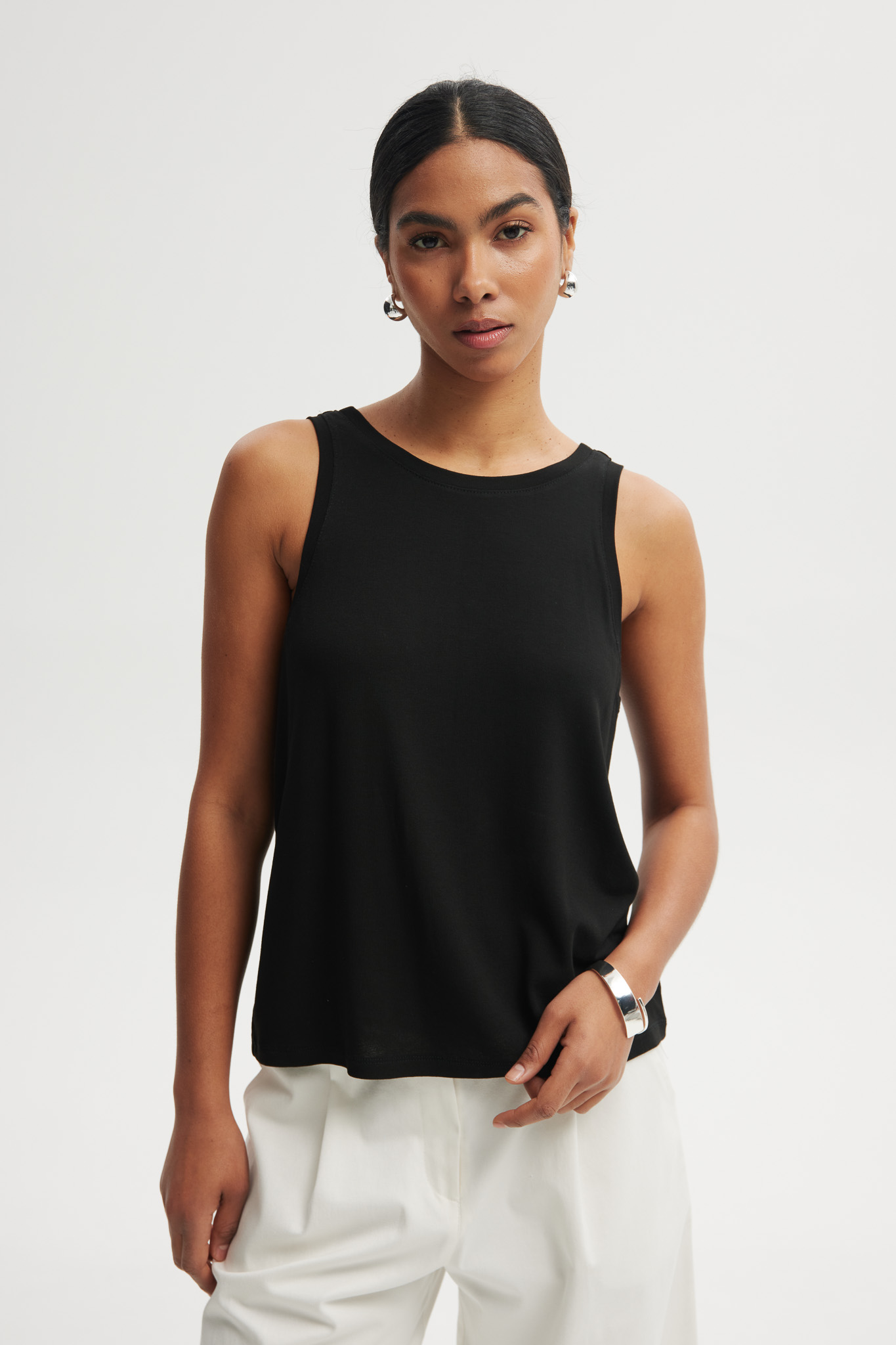 Lekki top damski wykonany z miękkiej wiskozy, który zapewnia komfort noszenia i przewiewność. Model o prostym, swobodnym kroju z klasycznym, zabudowanym dekoltem z przodu oraz efektownym, głębszym wycięciem na plecach. Minimalistyczny design sprawia, że top świetnie sprawdzi się zarówno w codziennych stylizacjach, jak i w bardziej eleganckich zestawach.