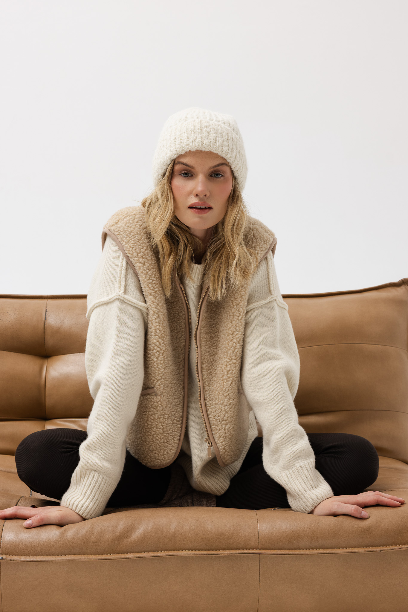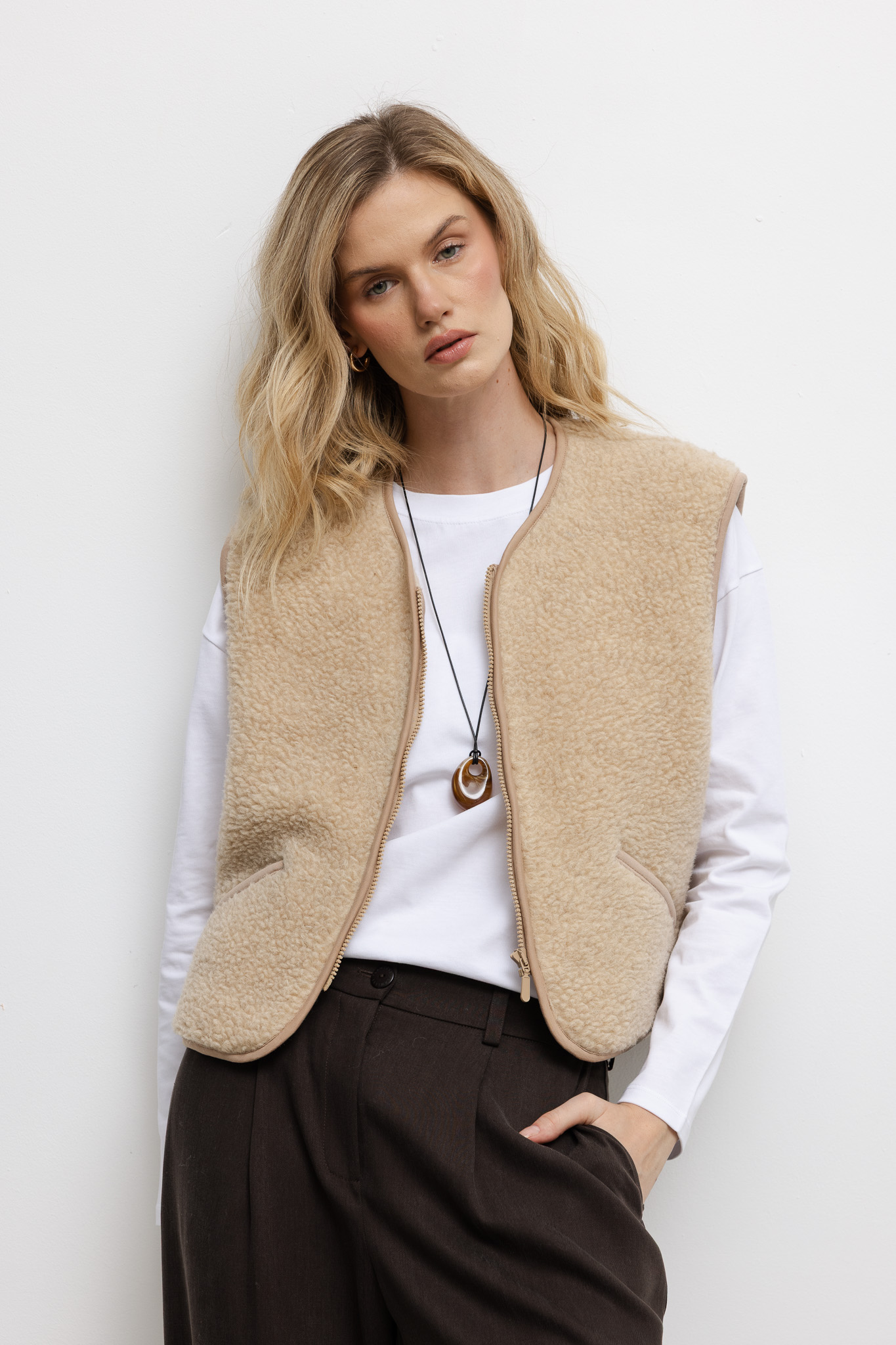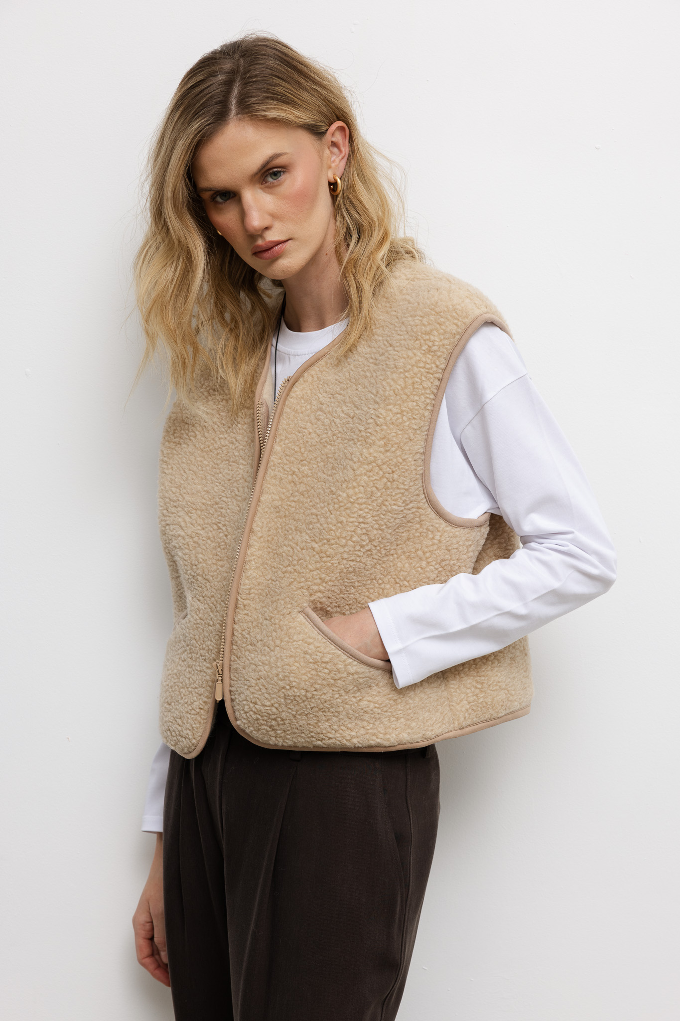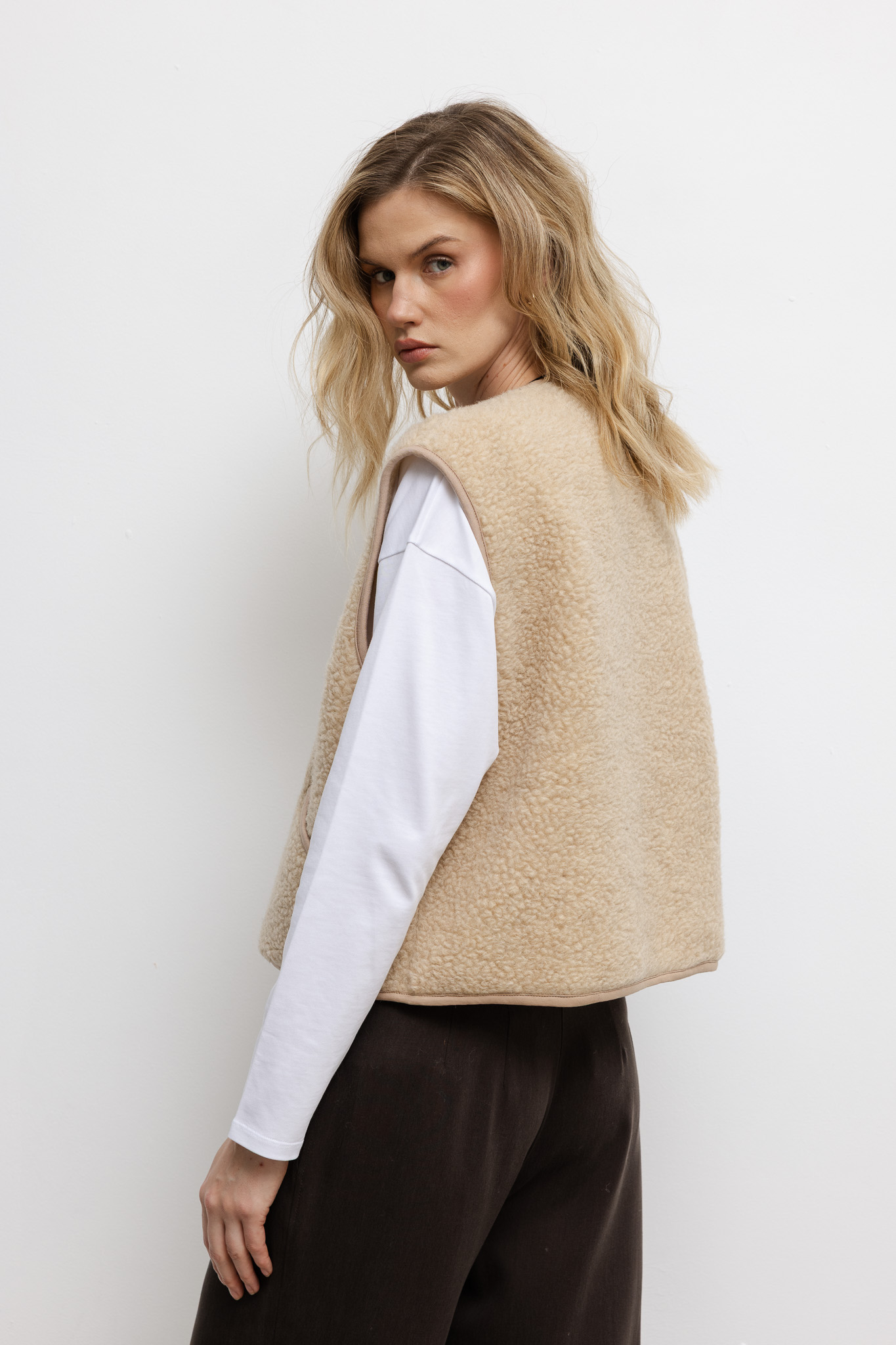 WEŁNIANA KAMIZELKA TEDDY BEŻOWA damska kamizelka typu baranek beżowa