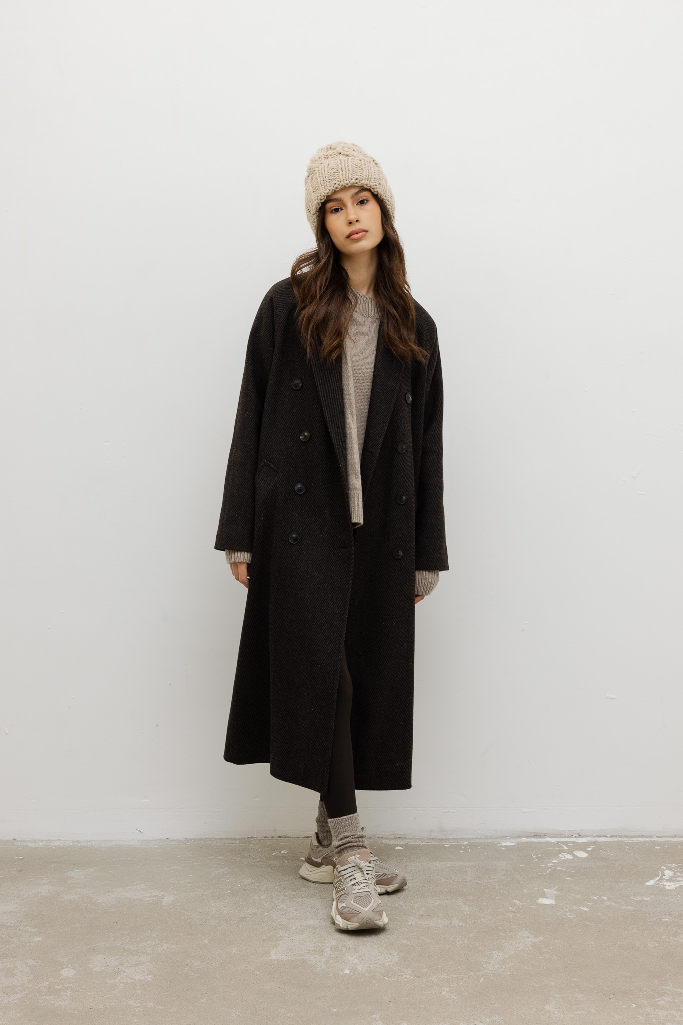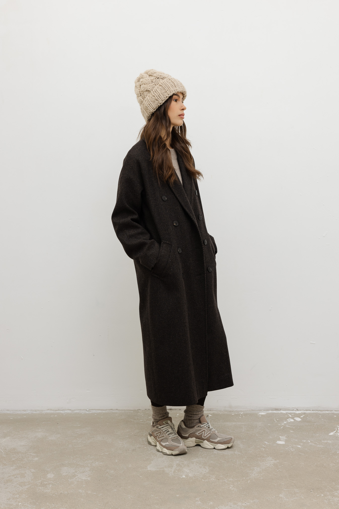 WEŁNIANY PŁASZCZ HARPER BRĄZOWY damski długi oversizowy płaszcz brązowy